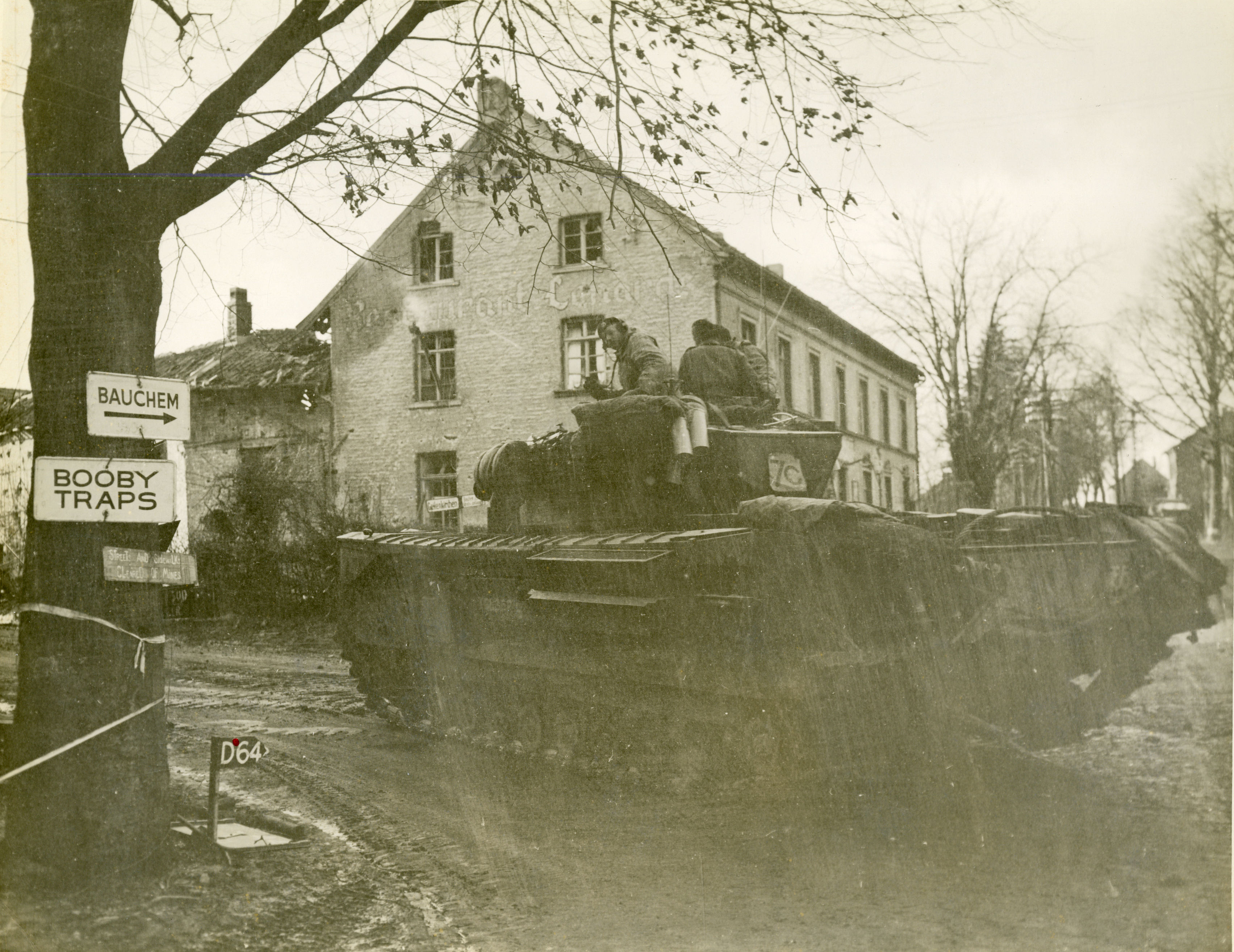 A Churchill tank of 147th Regiment, Royal Armoured Corps, 34th Tank Brigade, advances along a road near Geilenkirchen in Germany, December 1944.