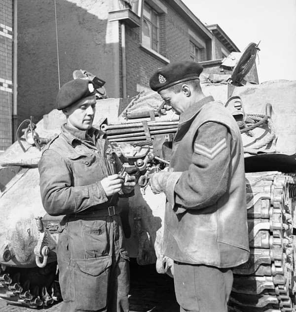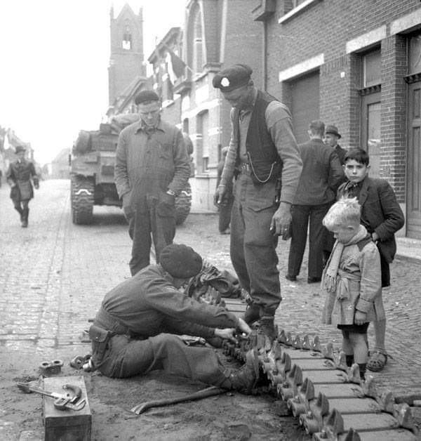 Corporal R. Young and Sergeant G.E. Murray, both of The Fort Garry Horse, repairing the track of a Sherman Vc Firefly tank, Putte, Netherlands, October 6th 1944.