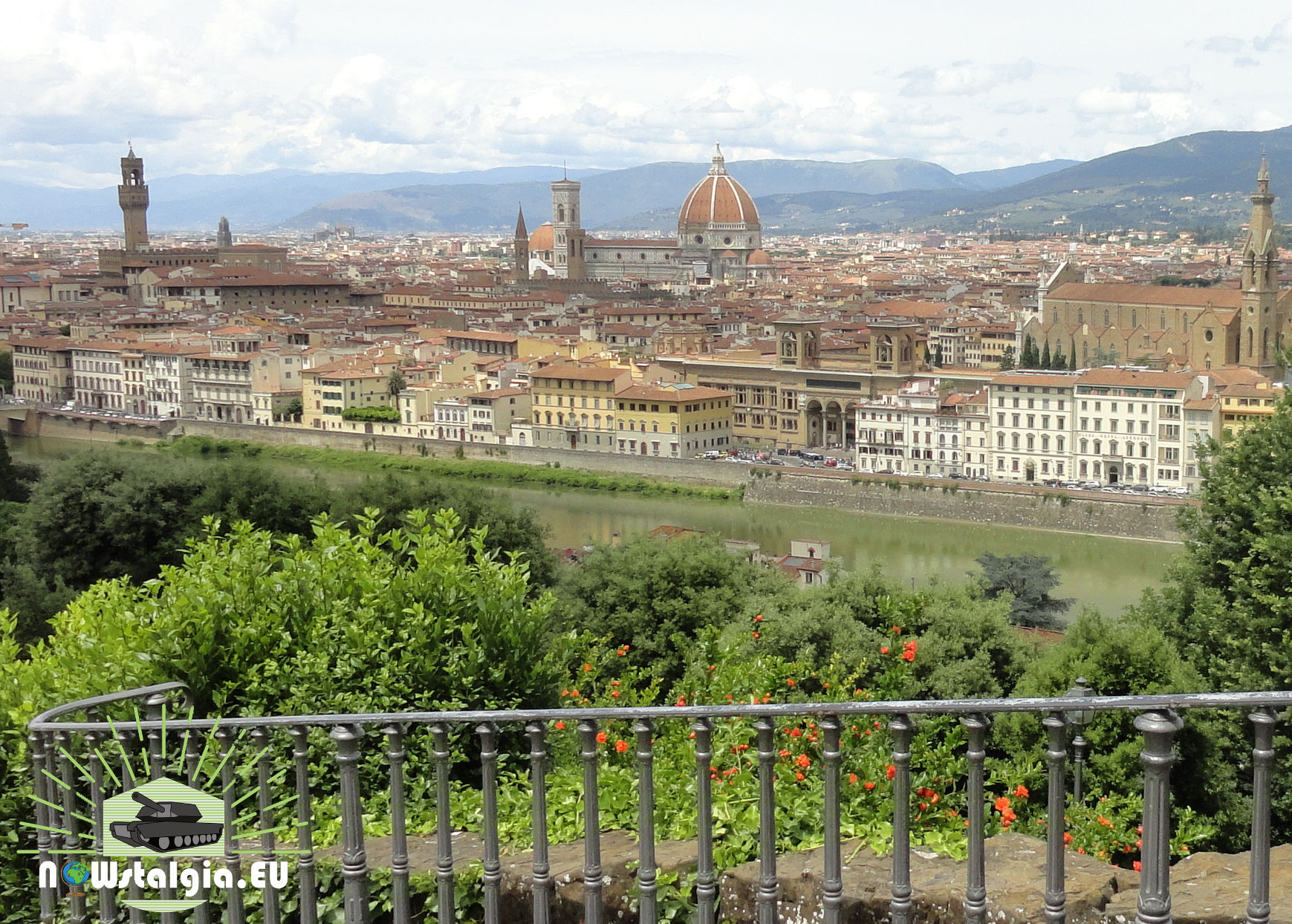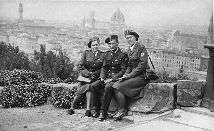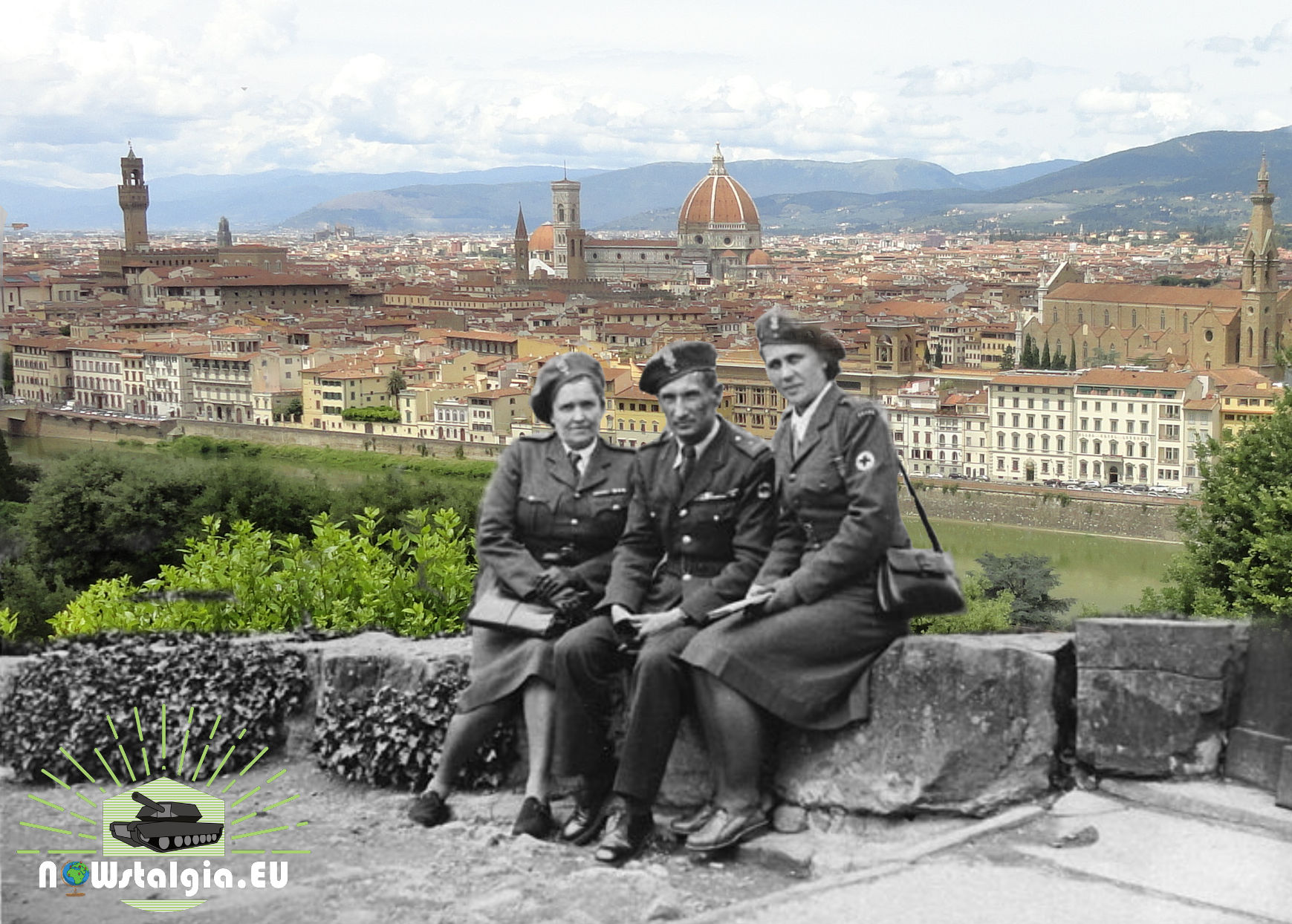Allied soldier and 2 nurses posing with the beautiful view of Florence in the background on the Piazzale Michelango in 1945.