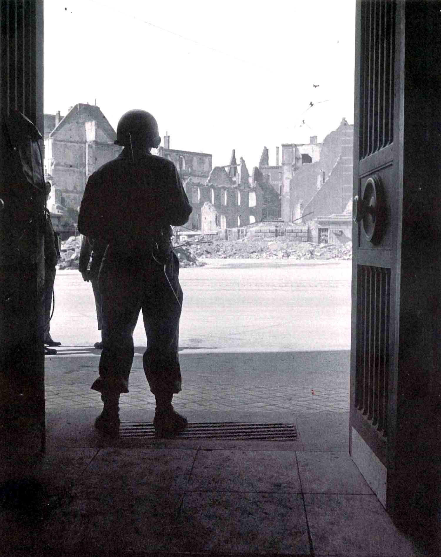 Guard before the entrance of a house at the Kaiser Wilhelm Ring, in which the Allied Military Heaquarters was located after the battle for the city, 10 April 1945.