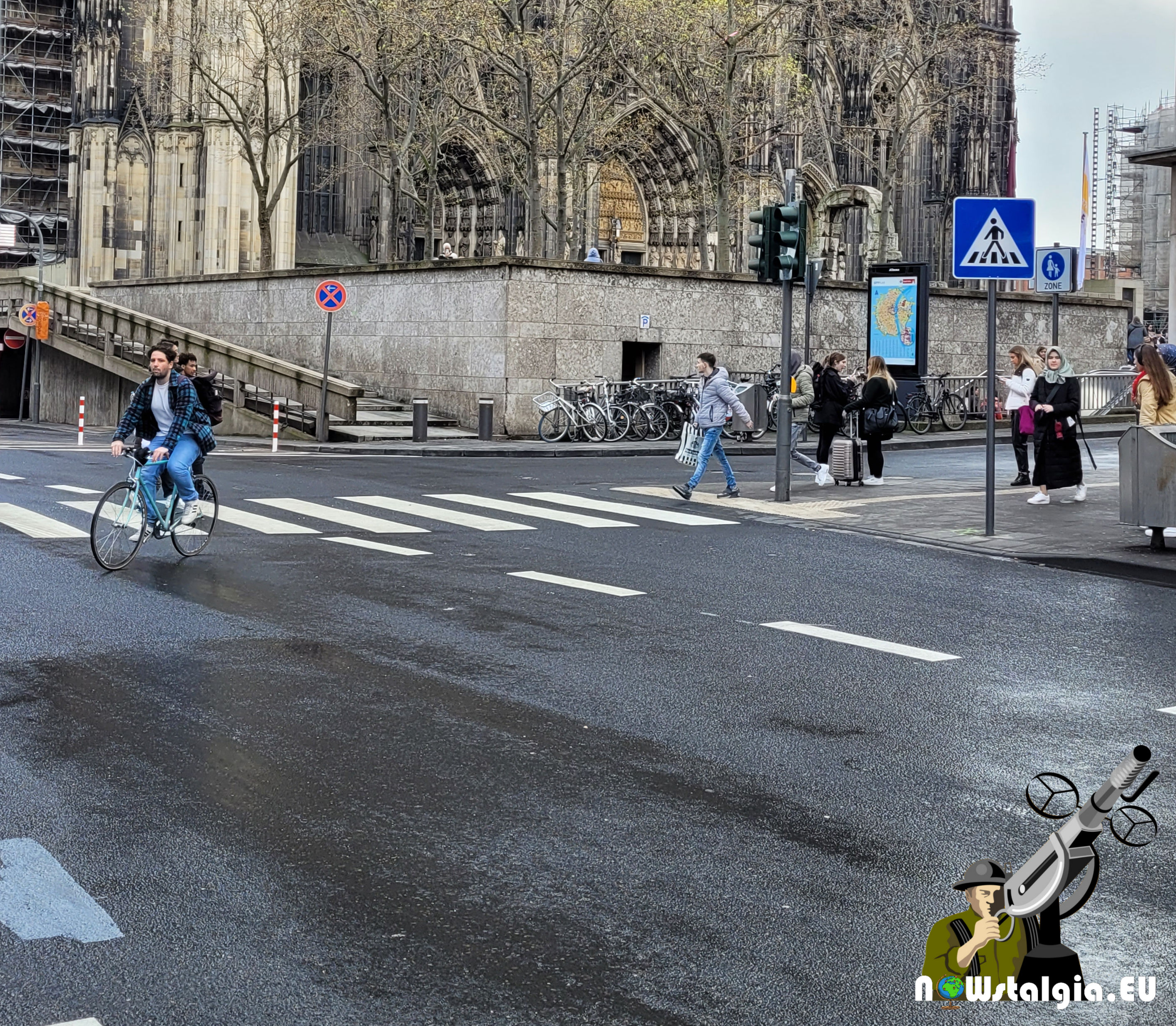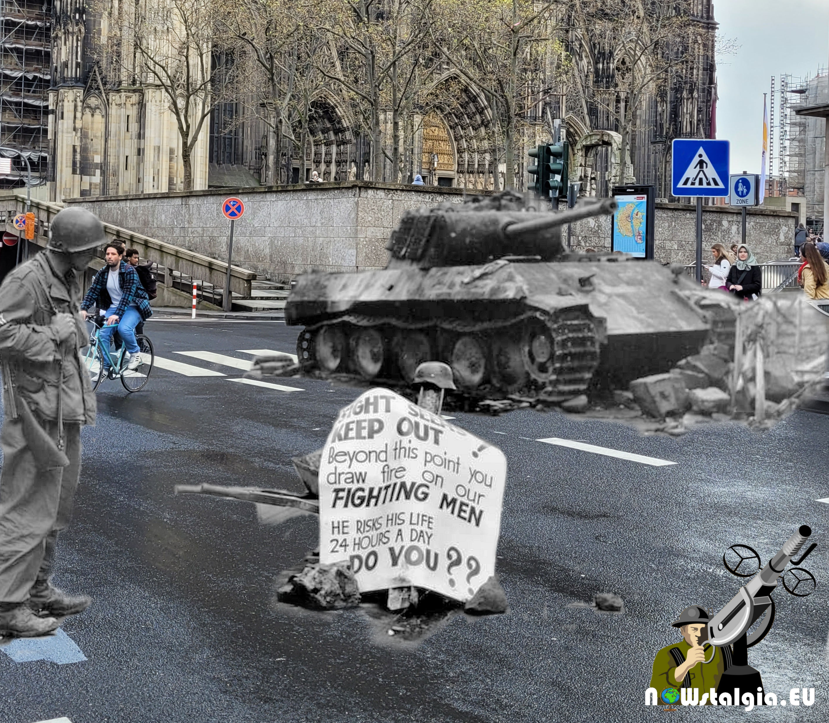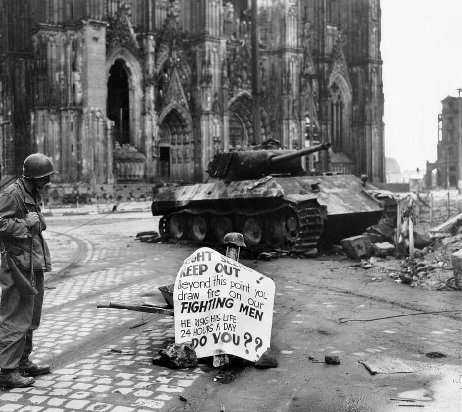 Soldier of US 82nd Airborne division reading a warning sign in front of Cologne Cathedral after the famous tankbattle, 4 April 1945.