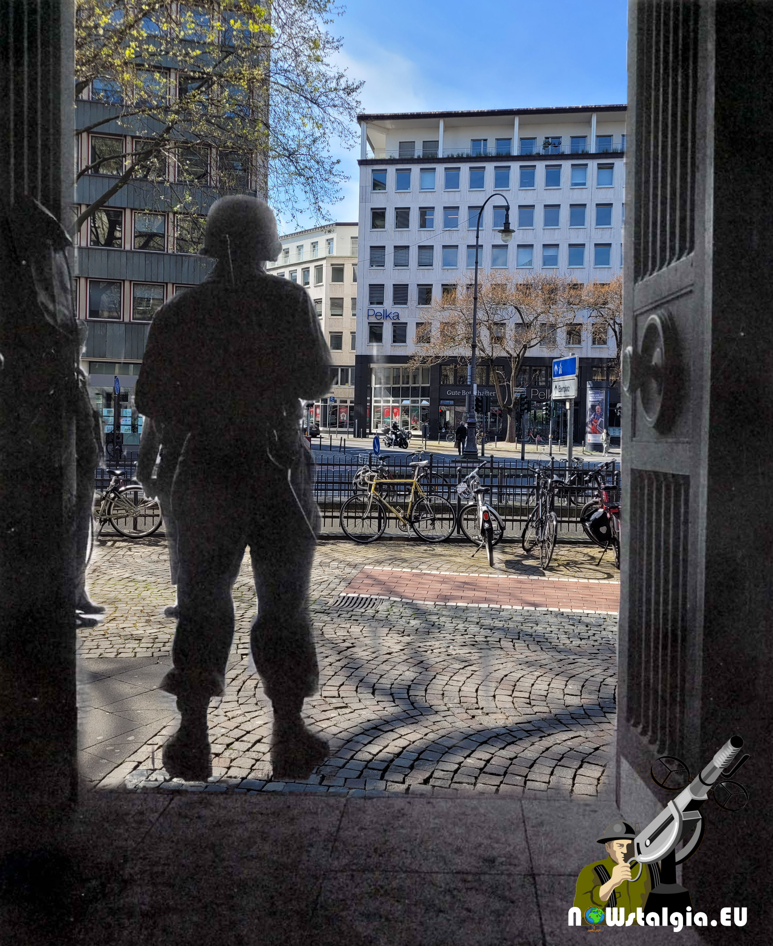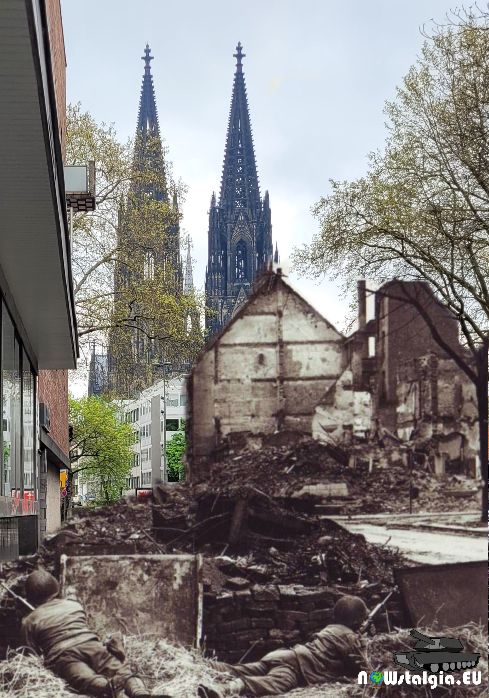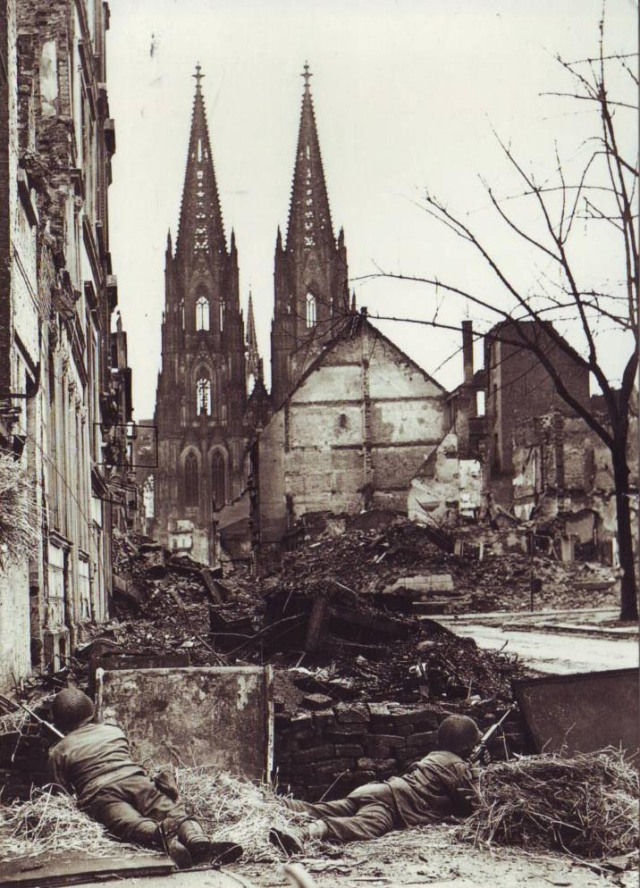 Allied soldiers hiding near the Römerbrunnen at the Burgmauer and almost reach the Dom Cathedral of Köln during the battle for the city, 6 March 1945.