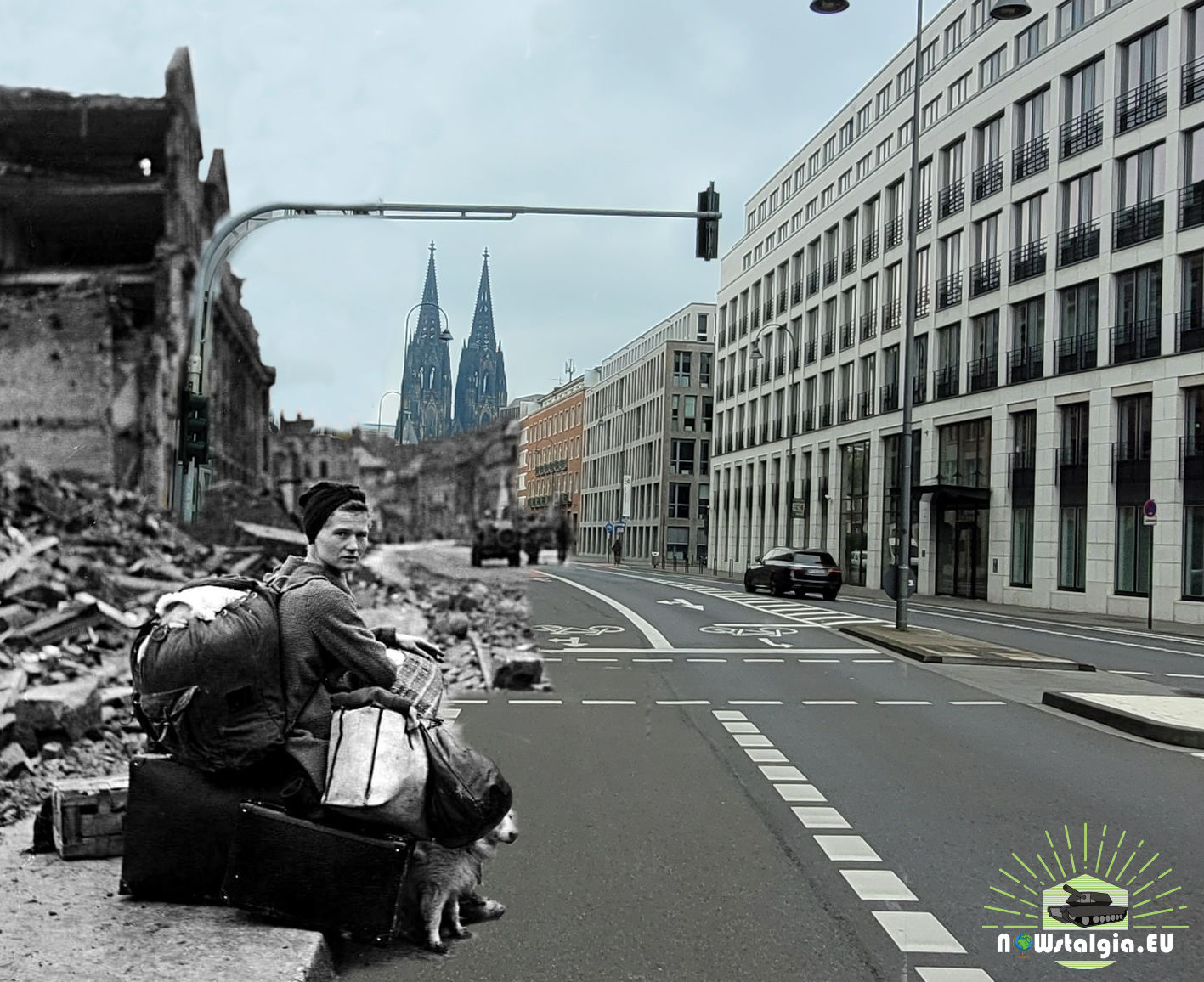 Woman sitting in the ruins of Cologne in the Gereonstraße while further way tanks moving forward to the Cathedral of Köln, 1945.