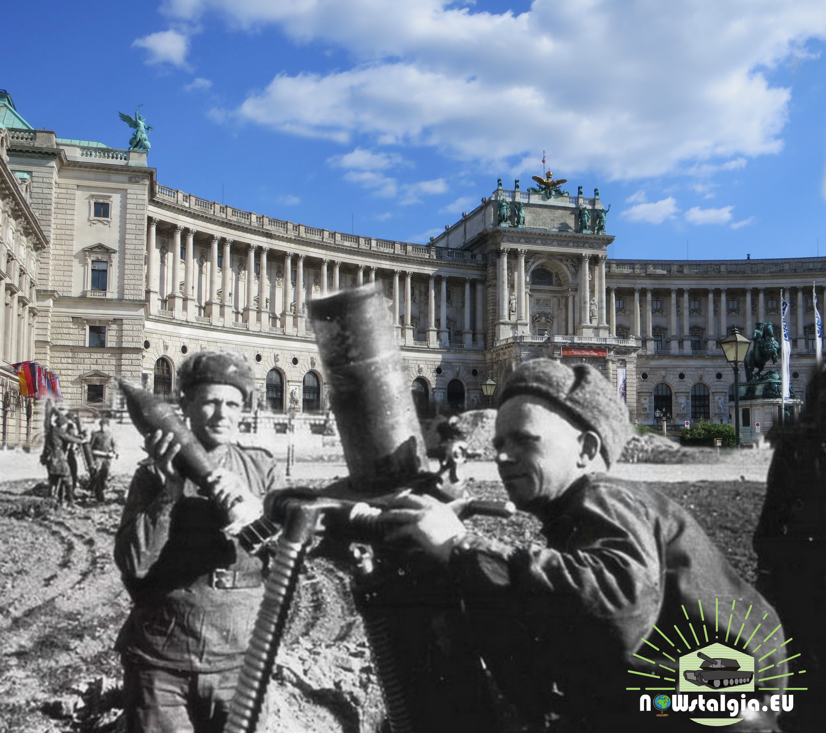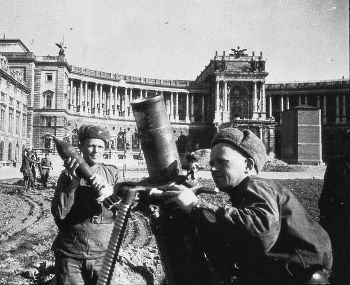 Soviet soldiers fire a mortar from the Hofburg Palace square during the battle for the city in May 1945.