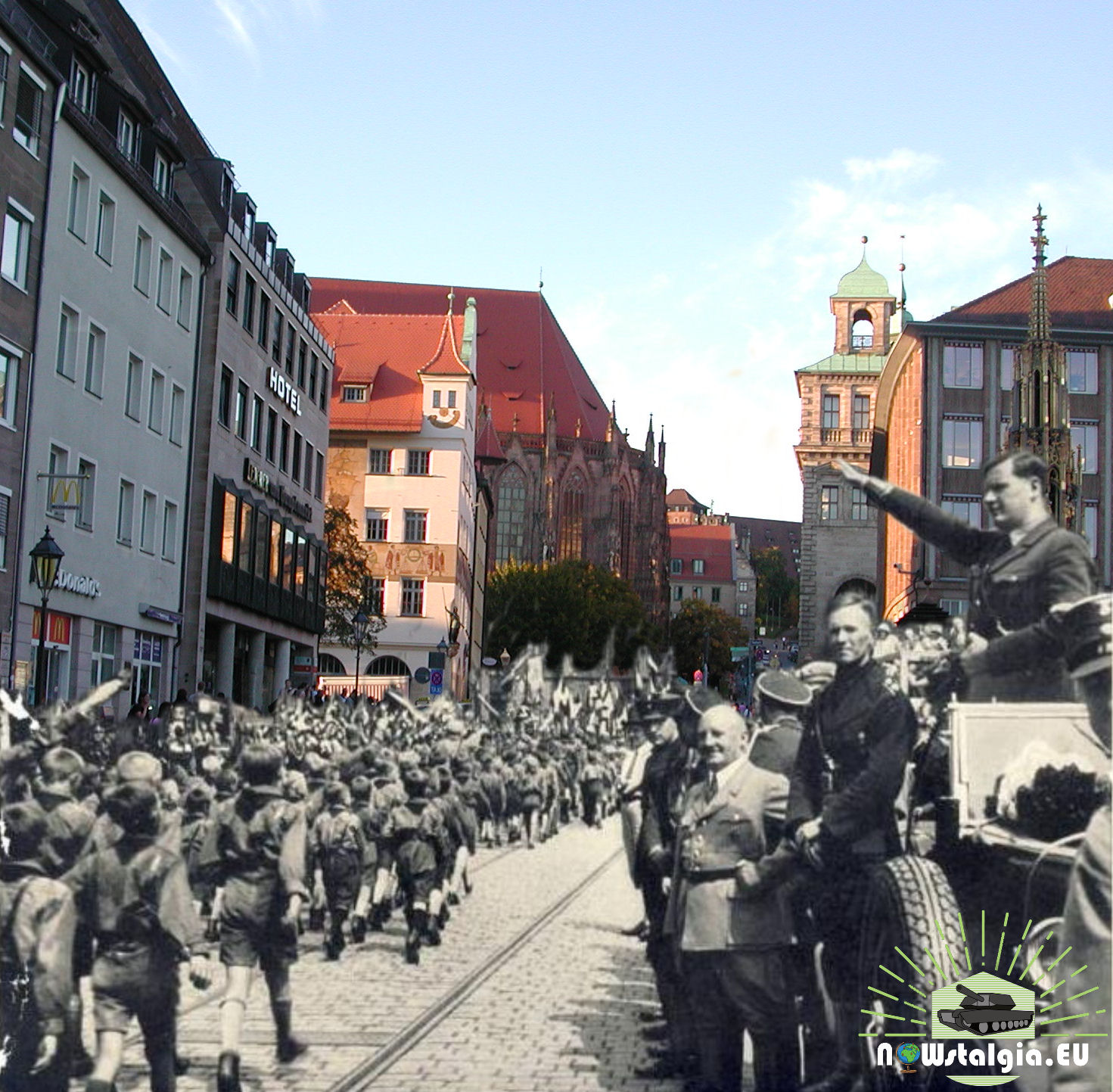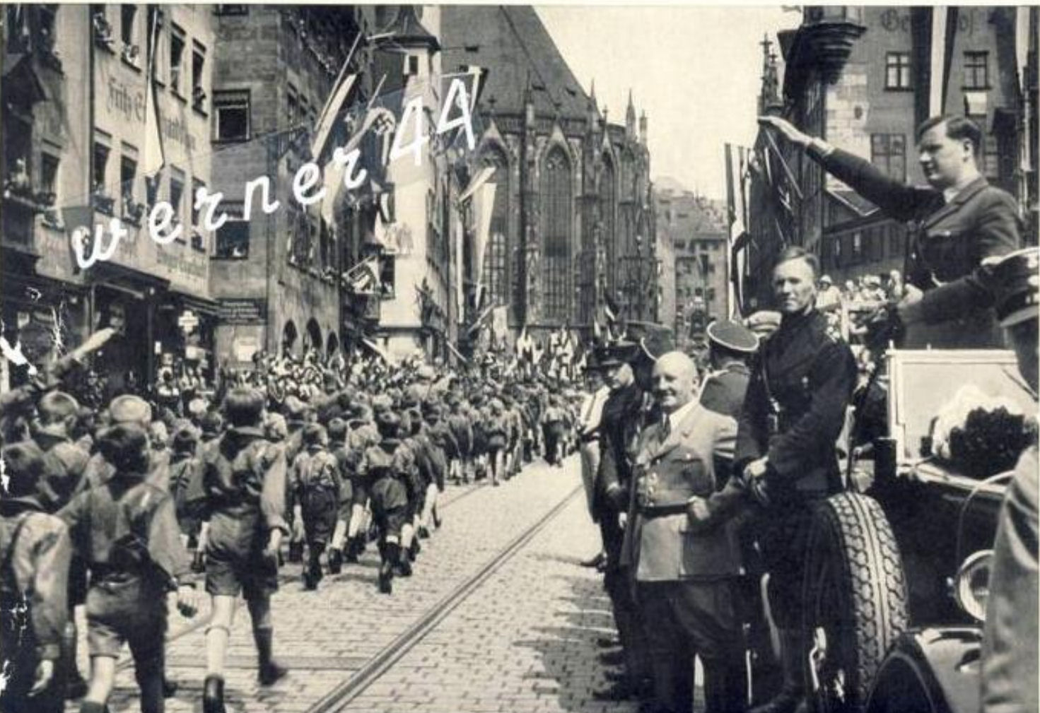 Hitler youth march in Nürnberg with Baldur van Schirach saluting his youth. With in front of him Julius Streicher of the anti-semic newspaper “Der Stürmer”.