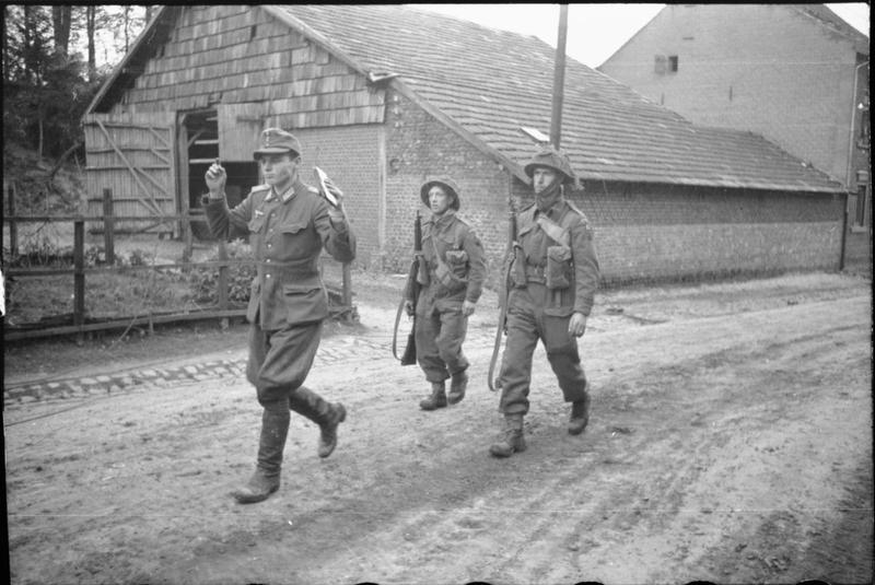 101st Airborne troops march through the town of Sainte-Marie-du-Mont during Operation Overlord, June 1944. It was the first town liberated during this operation.