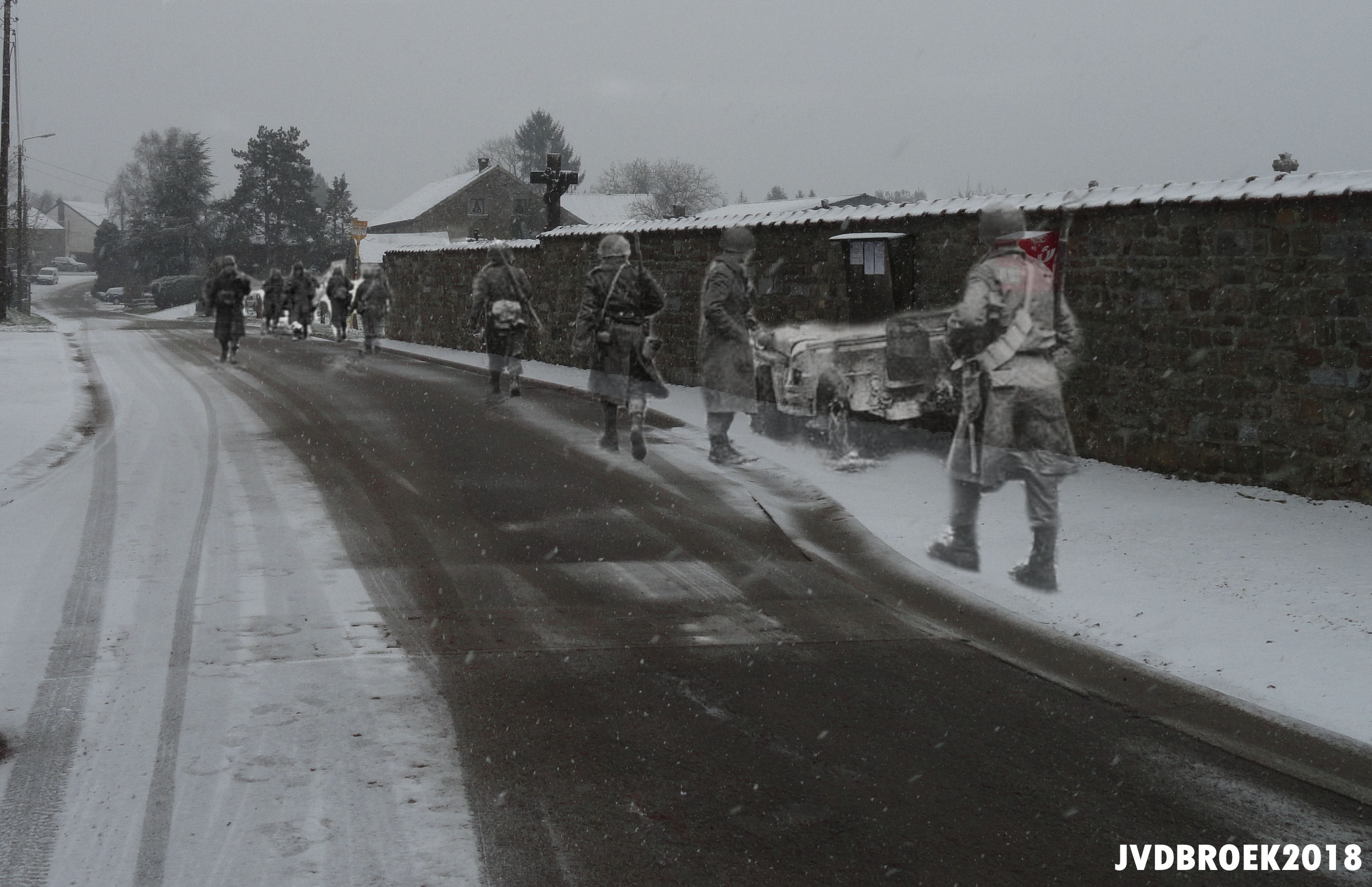 La Gleize after a fierce battle between the Americans and the Kampgruppe Peiper. The 800 German soldiers left around 135 vehicles (including a Tiger II) and fled on foot across the Amblève into the Forest.
