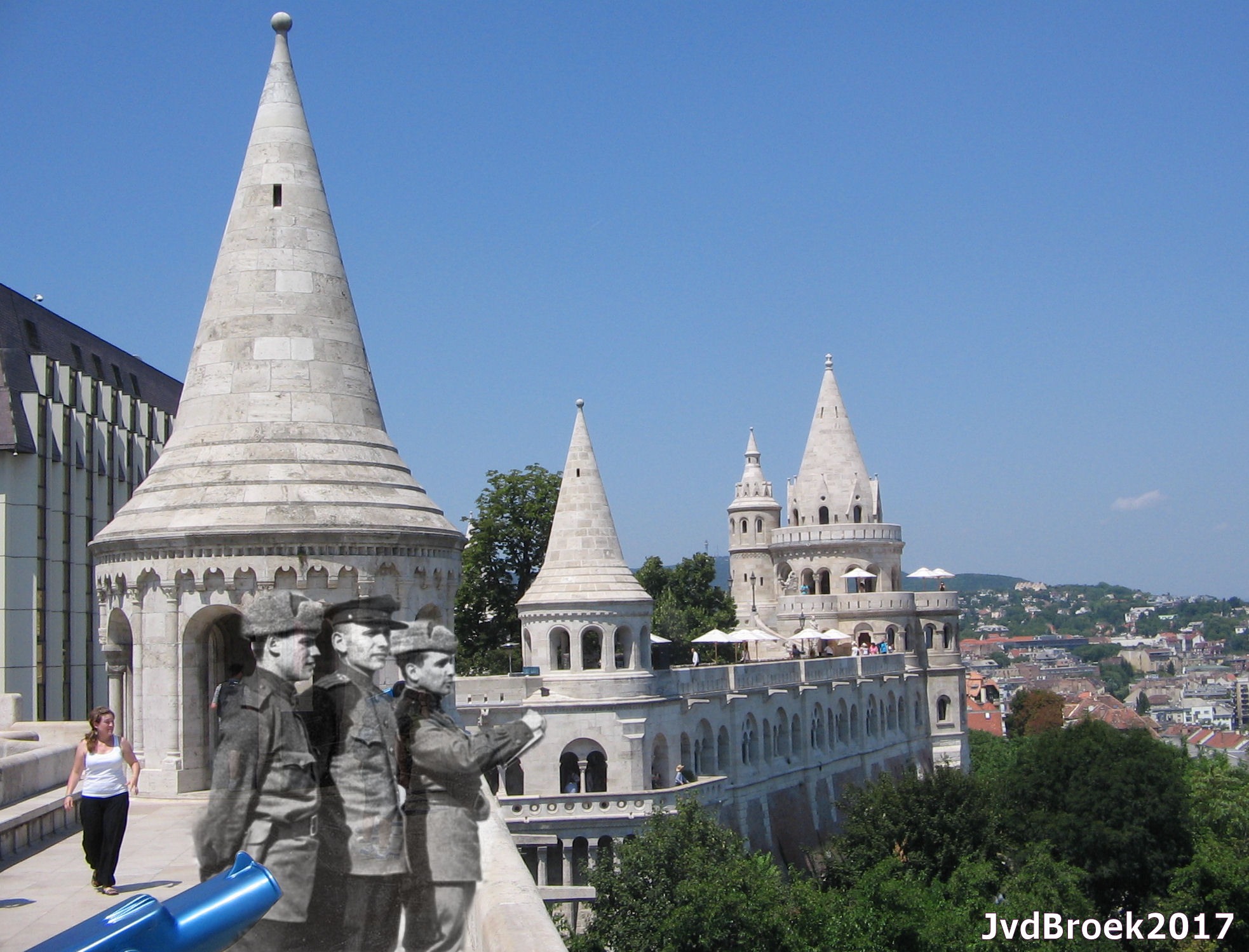 Three soviet officers look over the newly conquered Hungarian capital from the terrace of the Fishermans bastion in Budapest 1945.