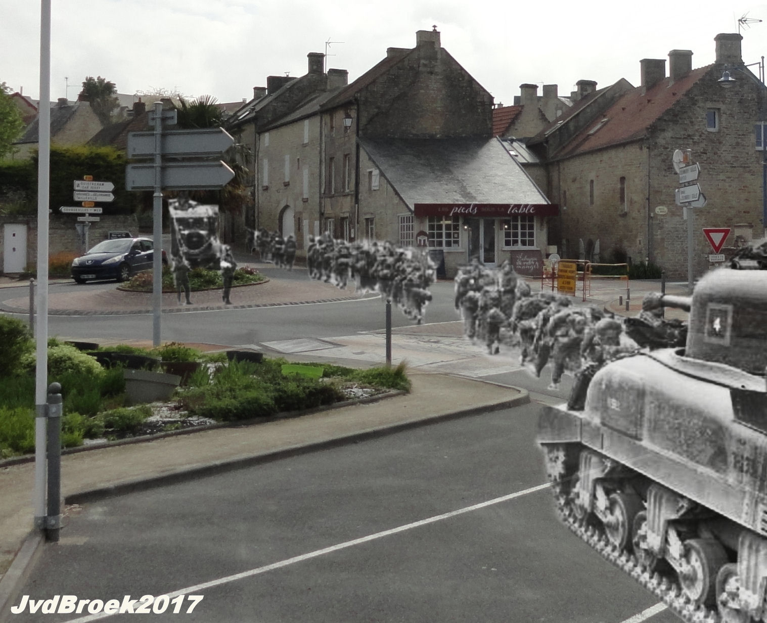 Infantry of 50th Division and Sherman tanks of 44th RTR, 4th Armoured Brigade, move through through Reviers, 12 June 1944.