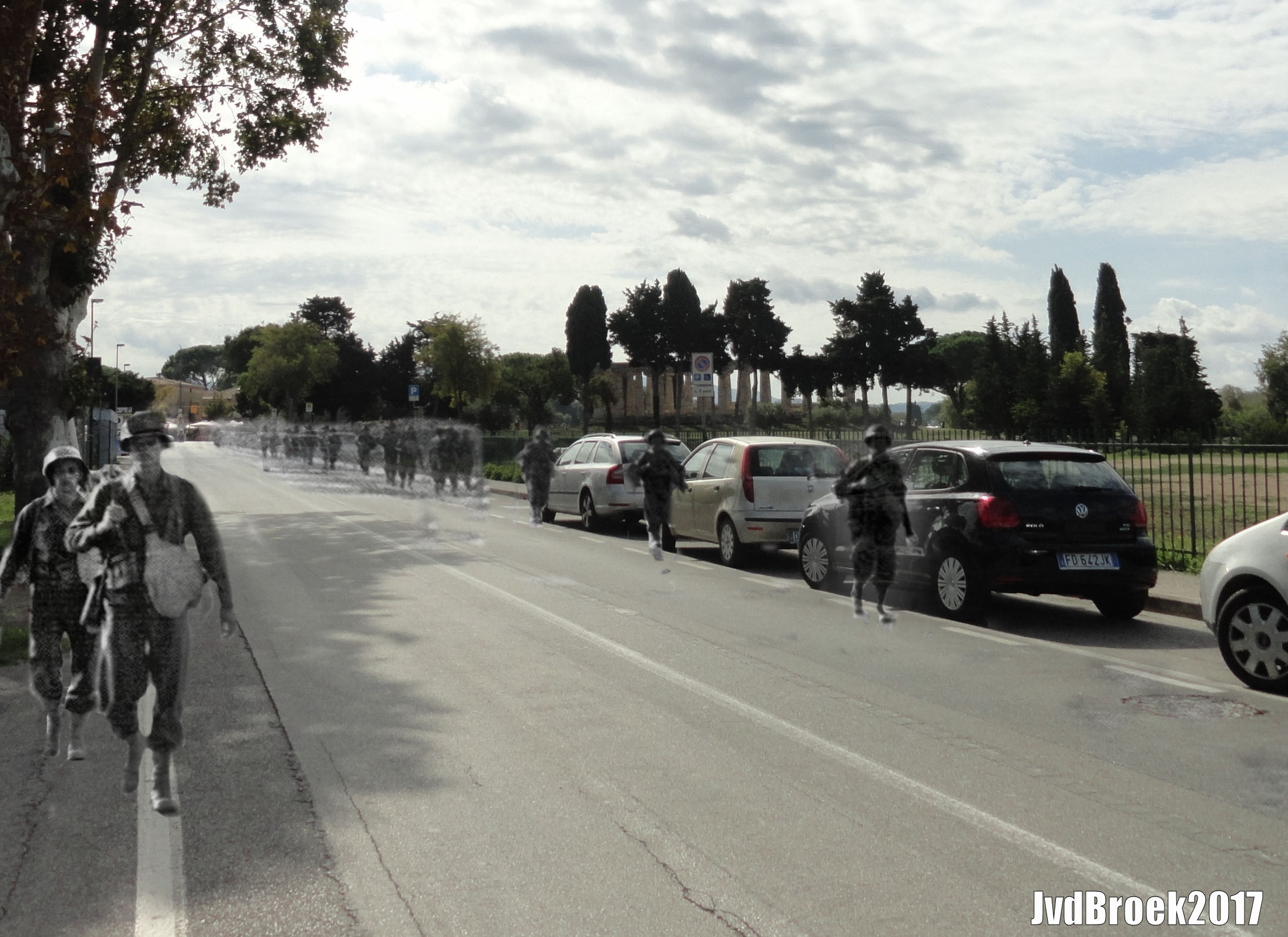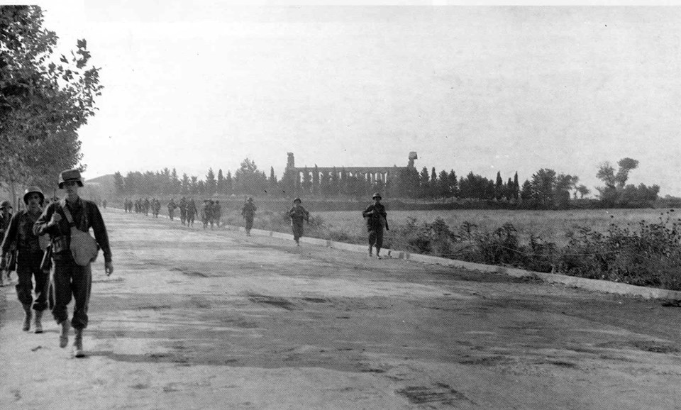Operation Avalanche: Allied Soldiers at Paestum, Italy, which served as US Fifth Army HQ after the landings at Salerno, September 1943. Here they walking towards the junction the Via Magna Graecia / Via Porta Aurea.
