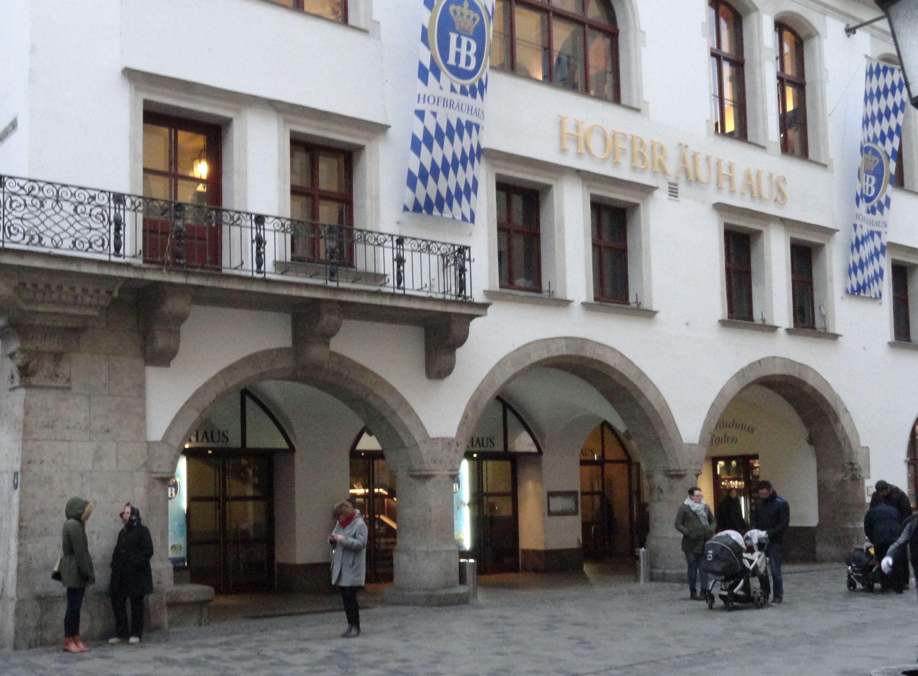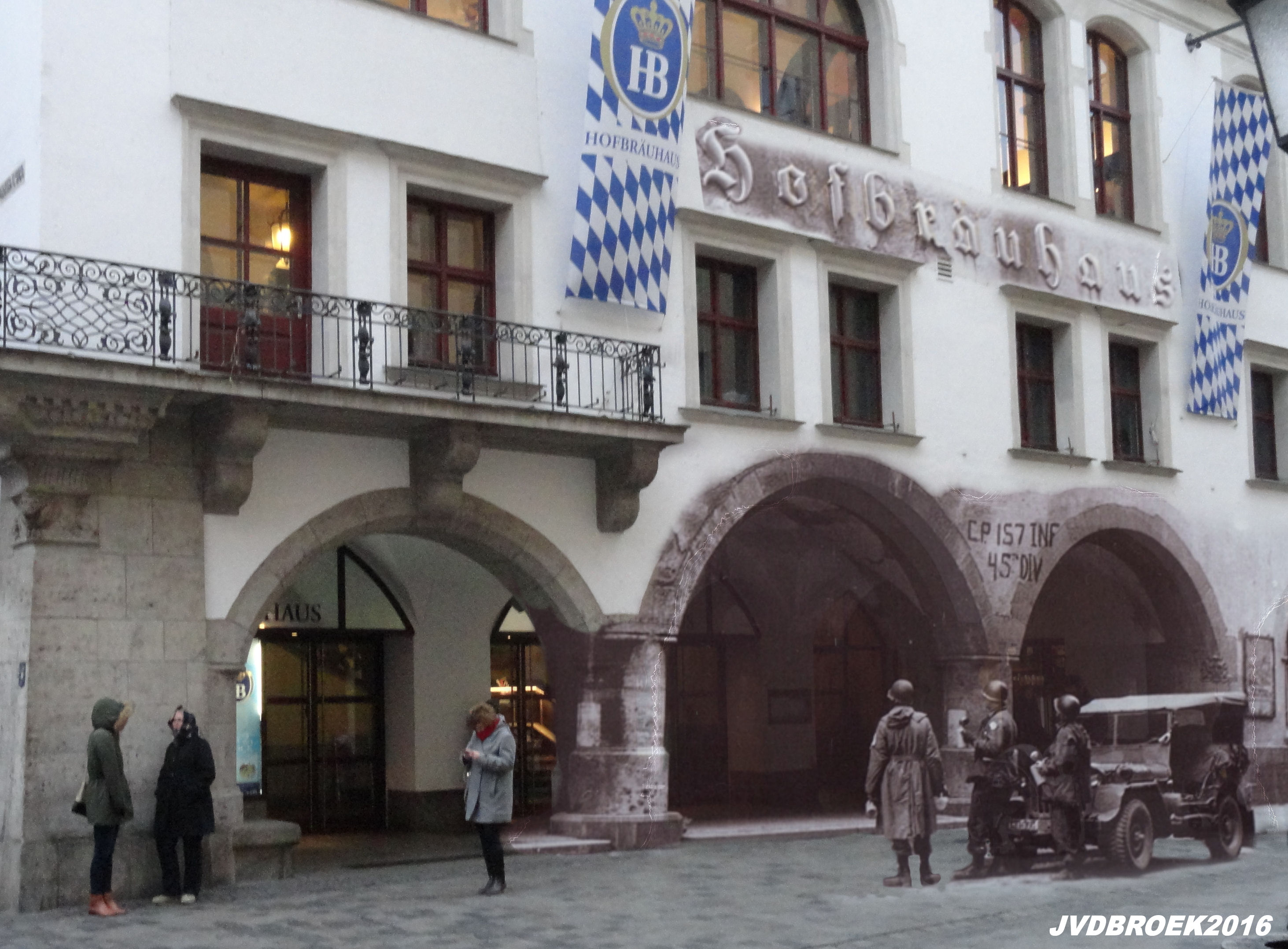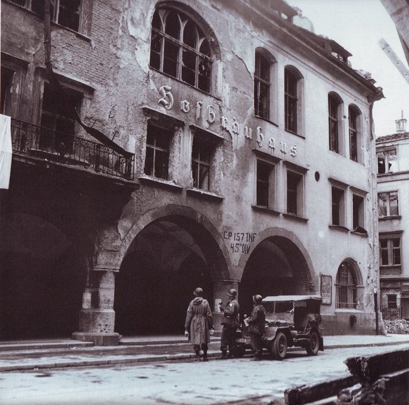 Allies in Munich 1945 at the Hofbrauhaus. The commandpost for the 45th division. Difficult then in now because I was not at the correct angle when I took the photo.