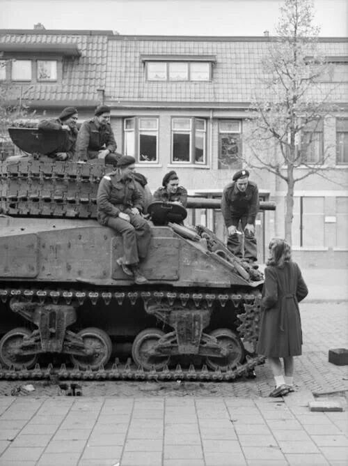A Dutch girl called Eliza Dina Gijzen converses with the crew of a Sherman tank of the South Alberta Regiment in Bergen op Zoom, Netherlands – 29 October 1944