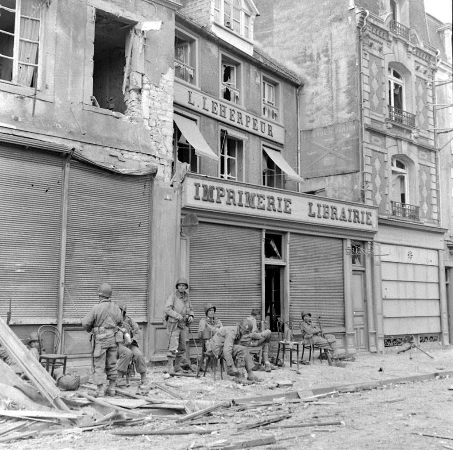 Soldiers of the 101st Airborne Division resting in Carentan, France at the Rue du Dr. Caillard.