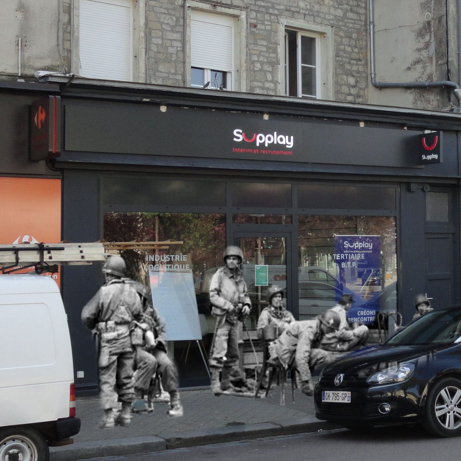 On the morning of June 6, Canadian prisoners of the Chaudière Regiment climbed the ramp of the castle (in the background the Saint Pierre church). Almost the same location. I had to replace them a little to the left because there is no ramp but a stairs today.
