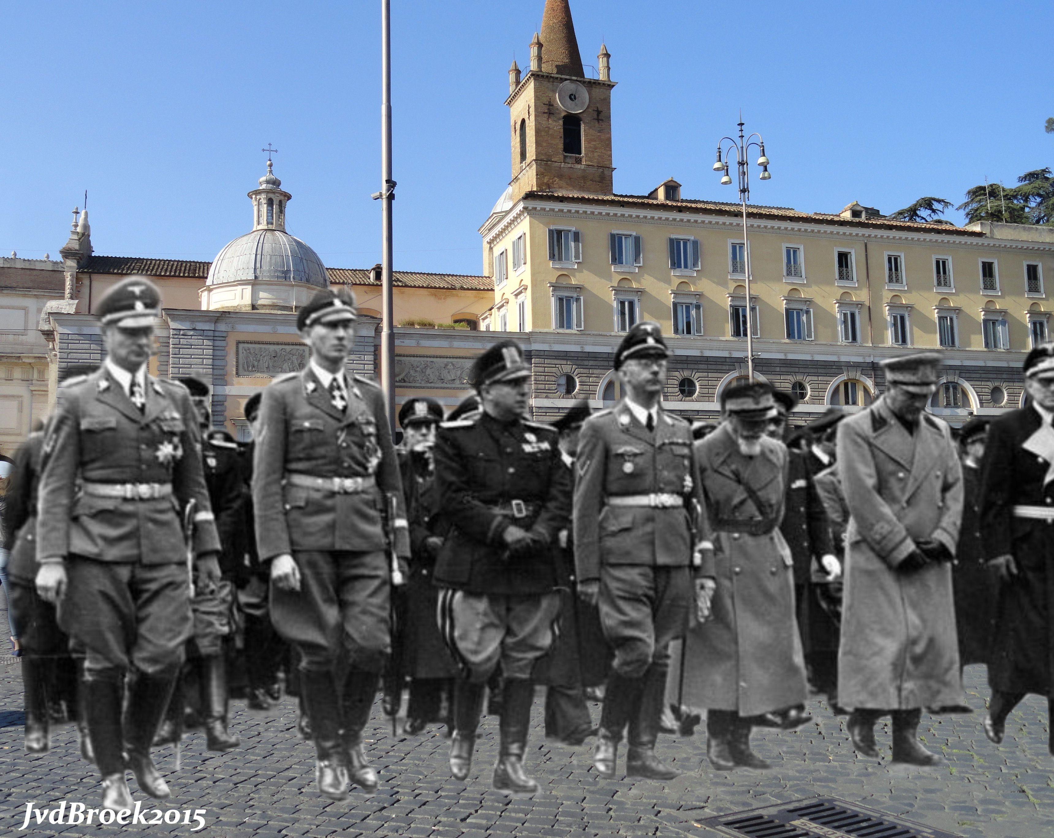 Funeral of Arturo Bocchini, Italian policeman, from left to right: SS group leader Karl Wolff, Reinhard Heydrich, Adelchi Serena, Heinrich Himmler, Emilio de Bono, Rodolfo Graziani, Hans Georg von Mackensen at the Piazza del Popolo in april 1940.