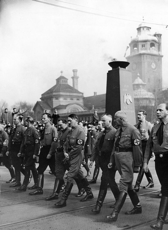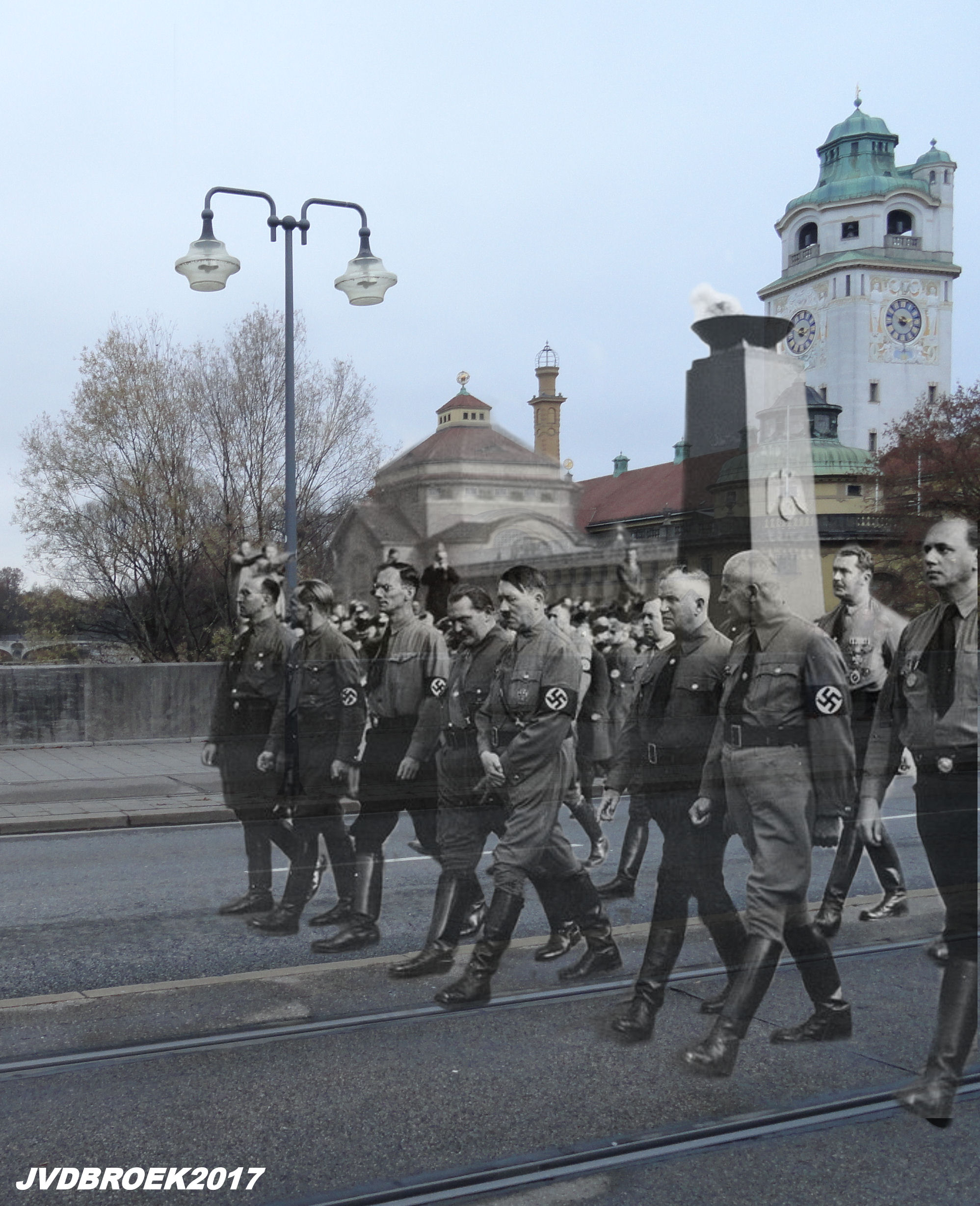 “Neunte Elfte” Remembering the Hitler Putsch in 1938. The nazi’s walking the same route as in 1923 the year of the putsch. Here they are walking over the Ludwigbrücke to the Isartor.