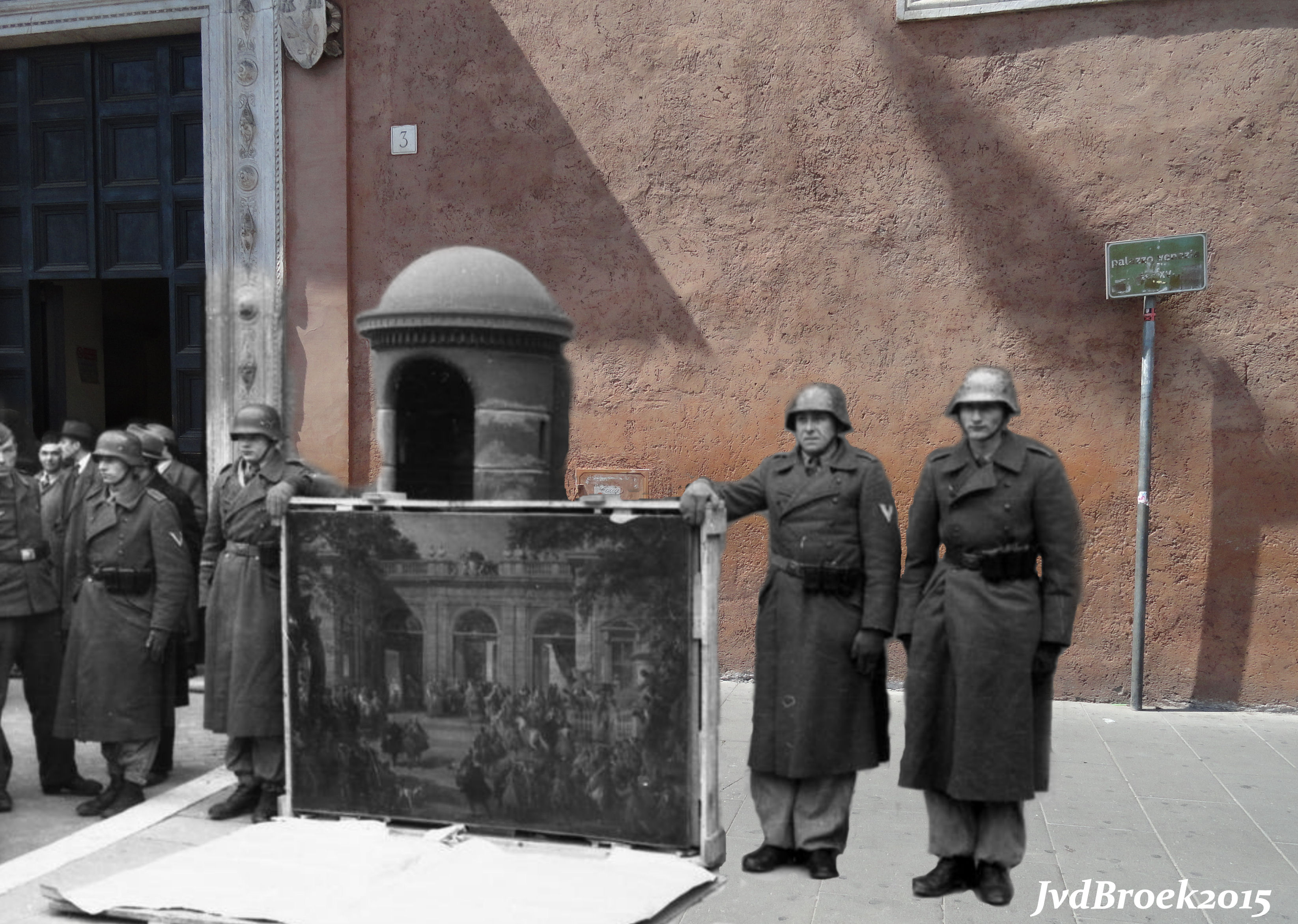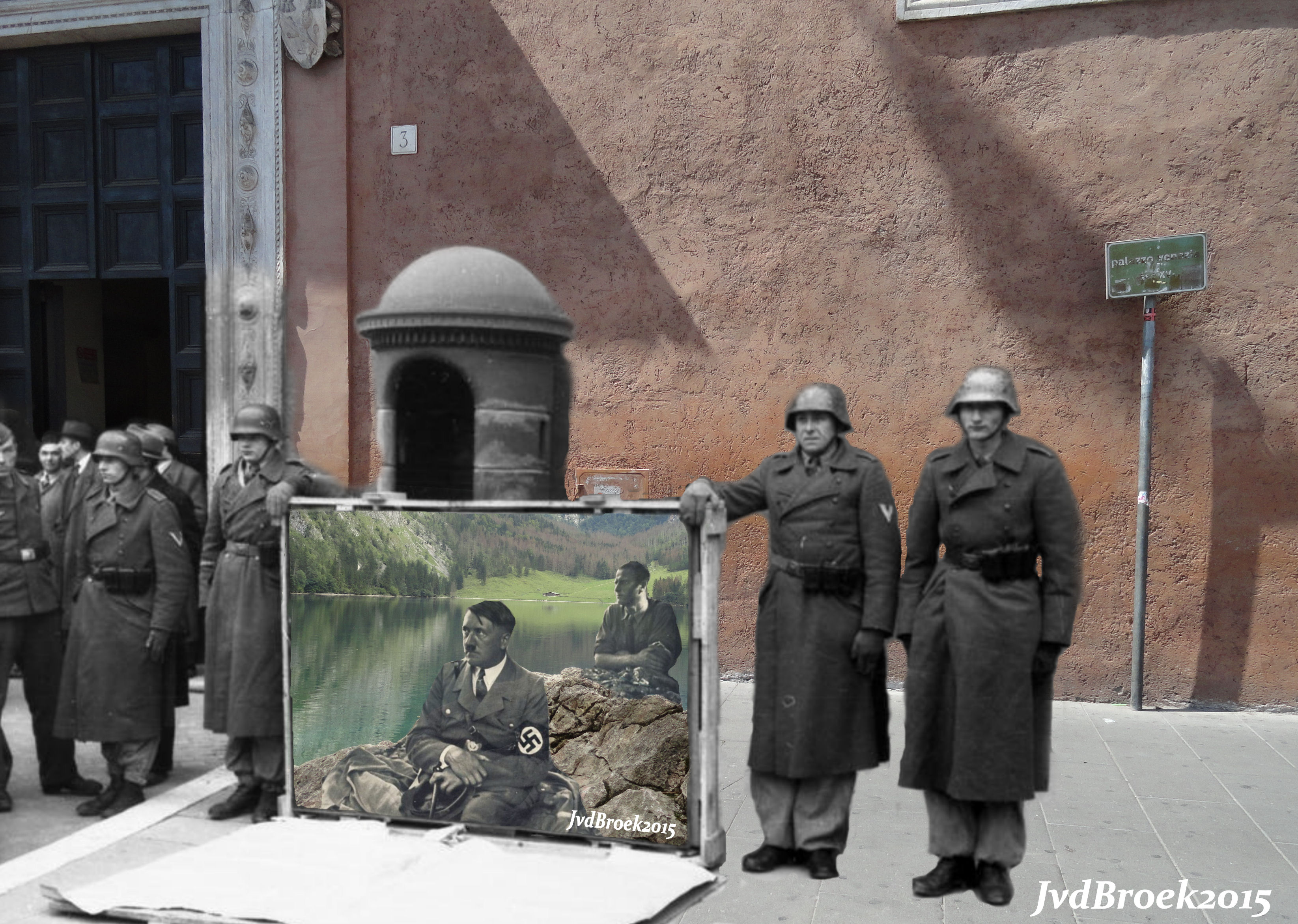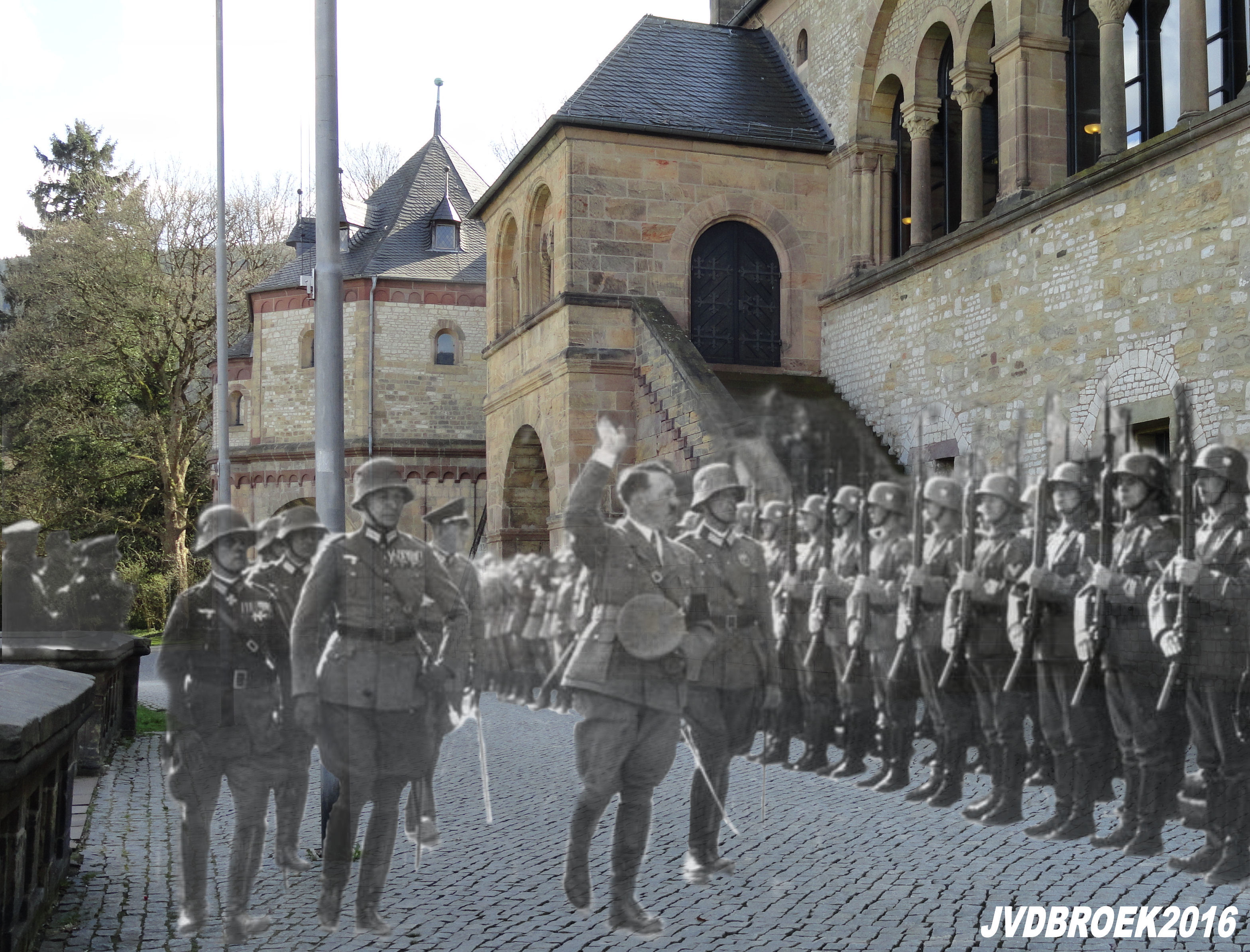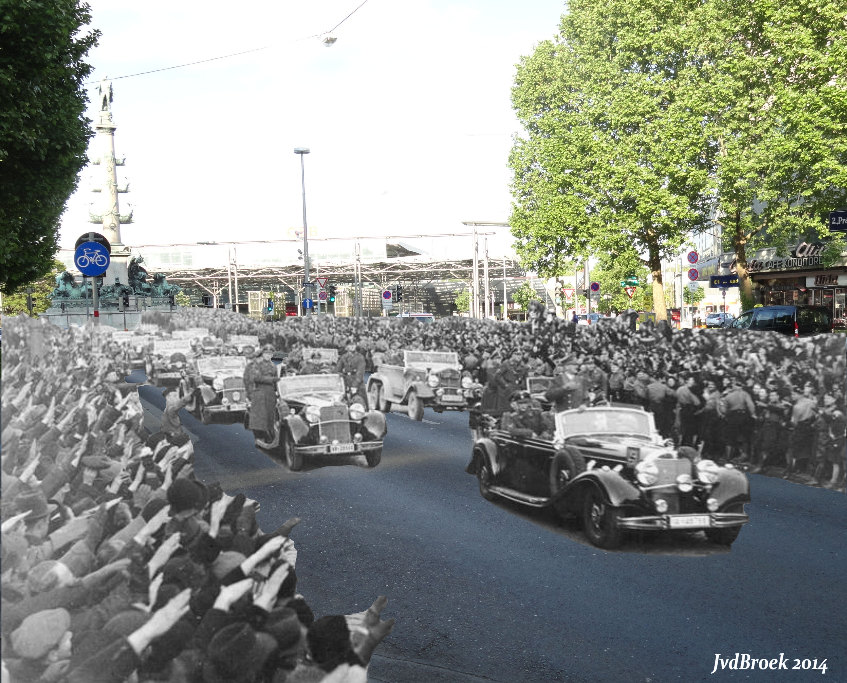 Victoryparade in Vienna after the Anschluss of Austria in March 1938. The Führer at the entrance of the Praterstern towards the inner city of Vienna. In the background on the left the Tegetthoff monument