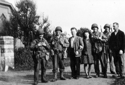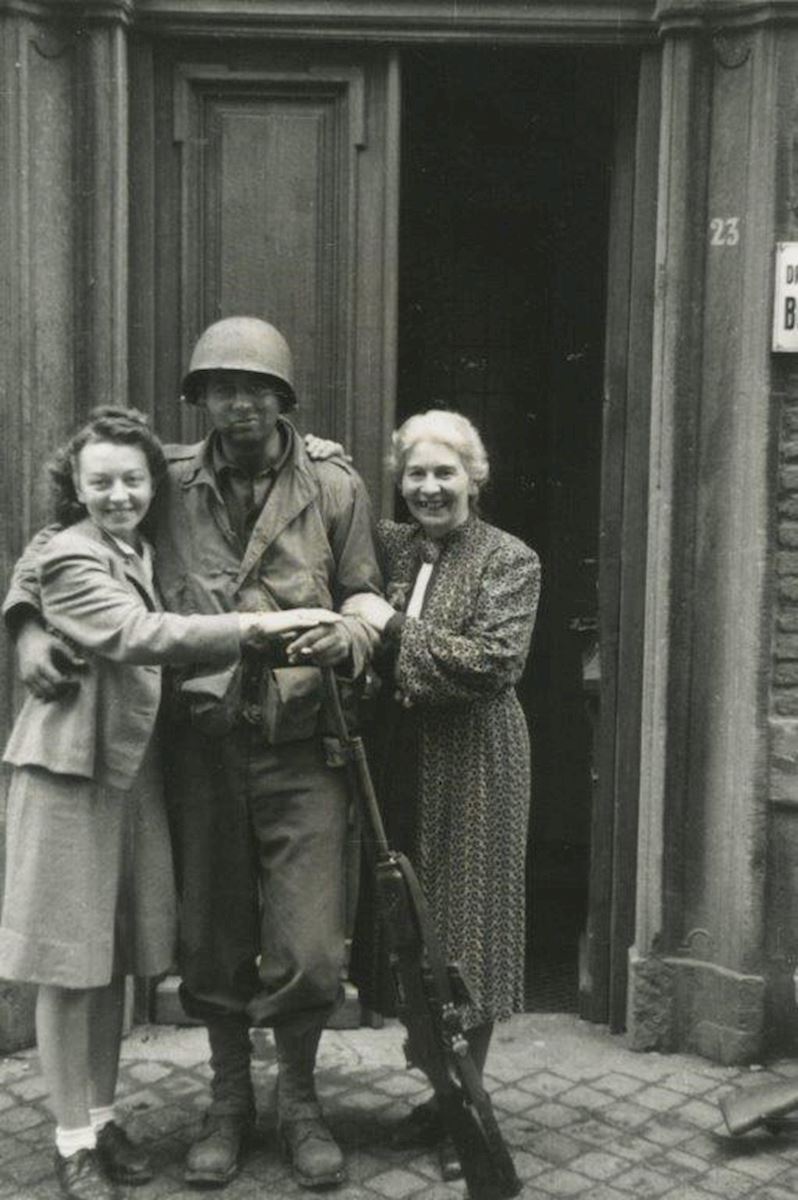 Allied soldier posing with locals after the liberation of Maastricht in 1944.