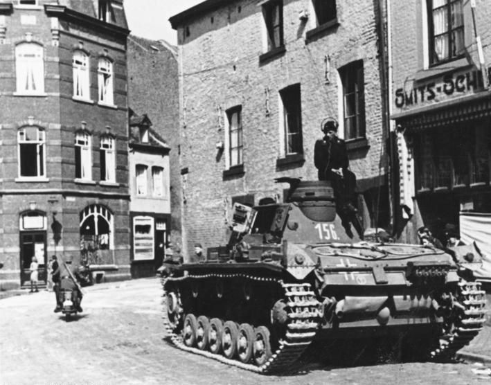Panzersoldier at a Panzer III (Turmnummer 156) taking a break during the battle of Maastricht at 10 May 1940.