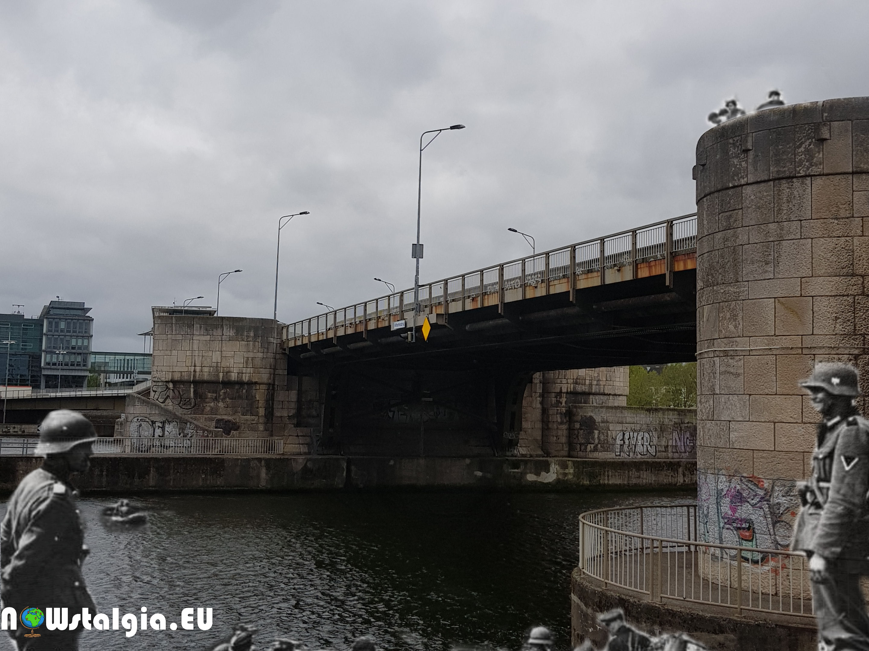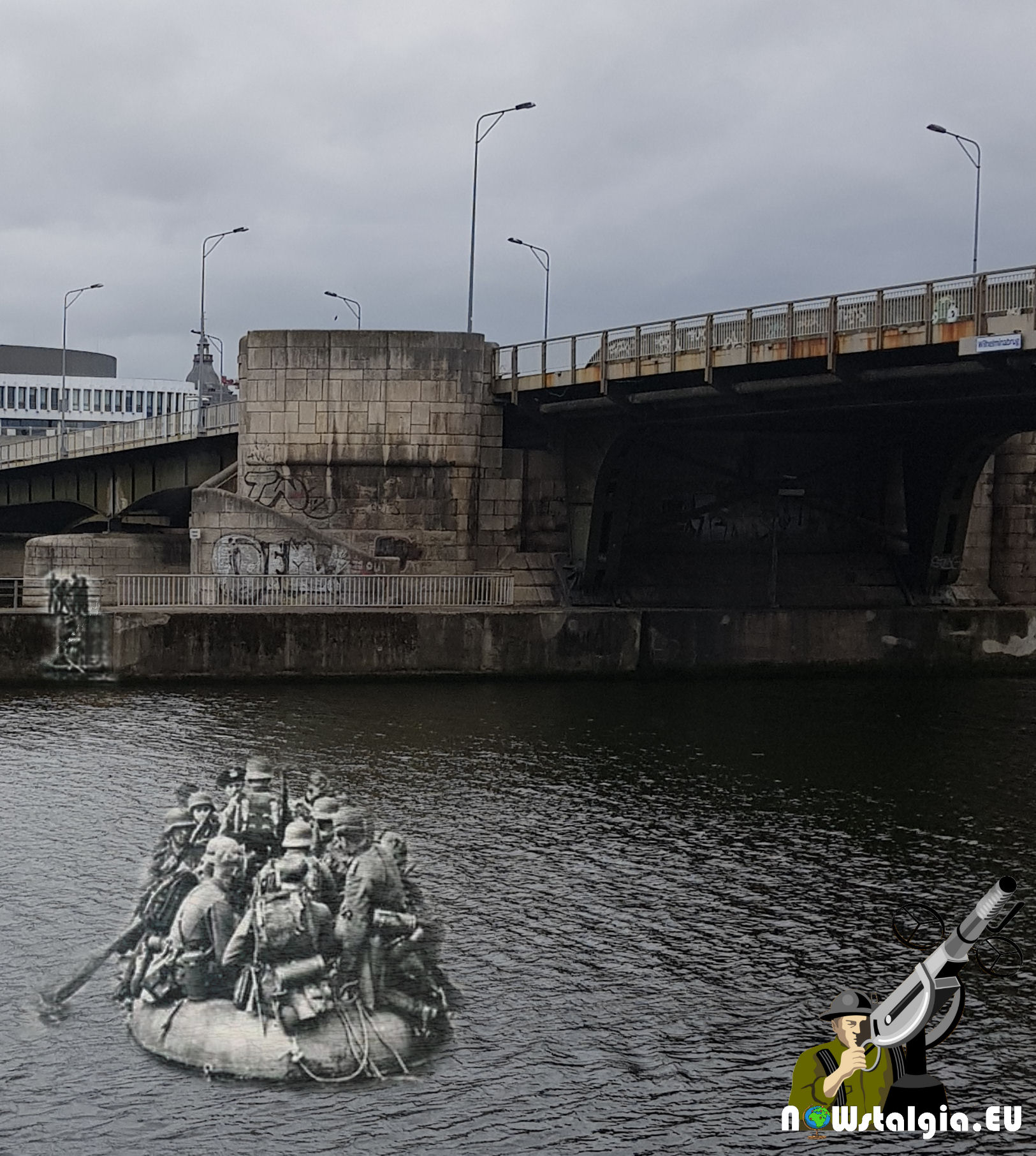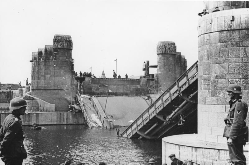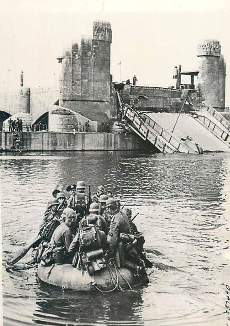 German troops are set across the Maas river in pneumatic boats. To the right is the Wilhelmina bridge that was destroyed by the dutch troops in the hopes it would stop the German advance, may 1940.