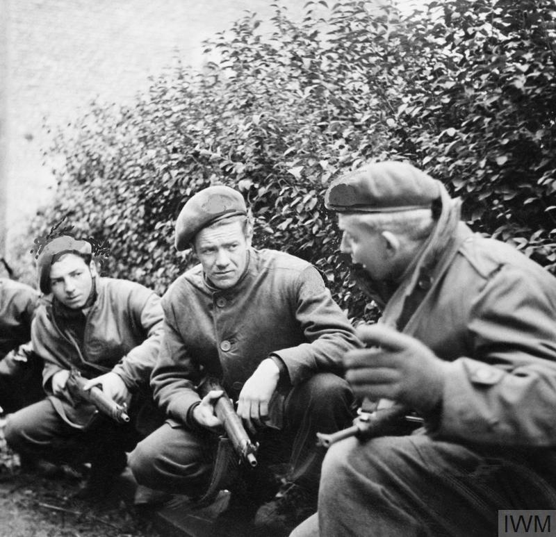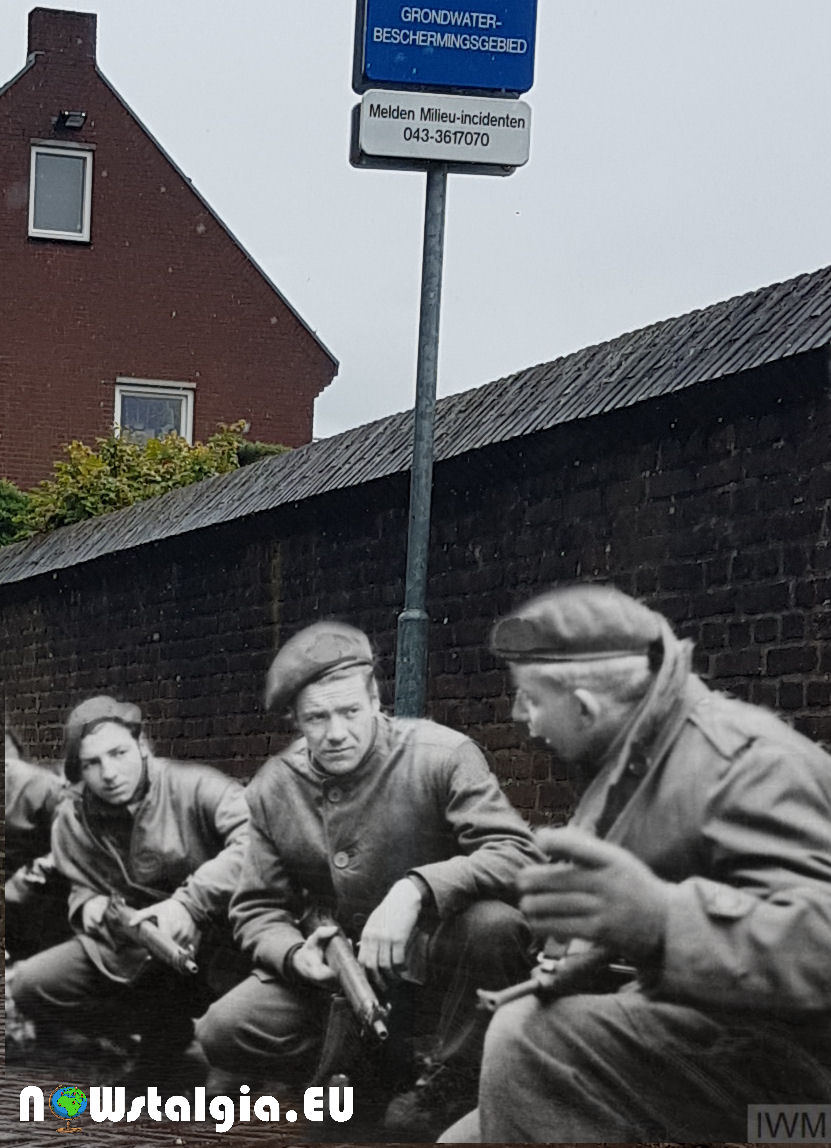 Troops of the 1st Rifle Brigade walking carefully through the villlage of Nieuwstadt,