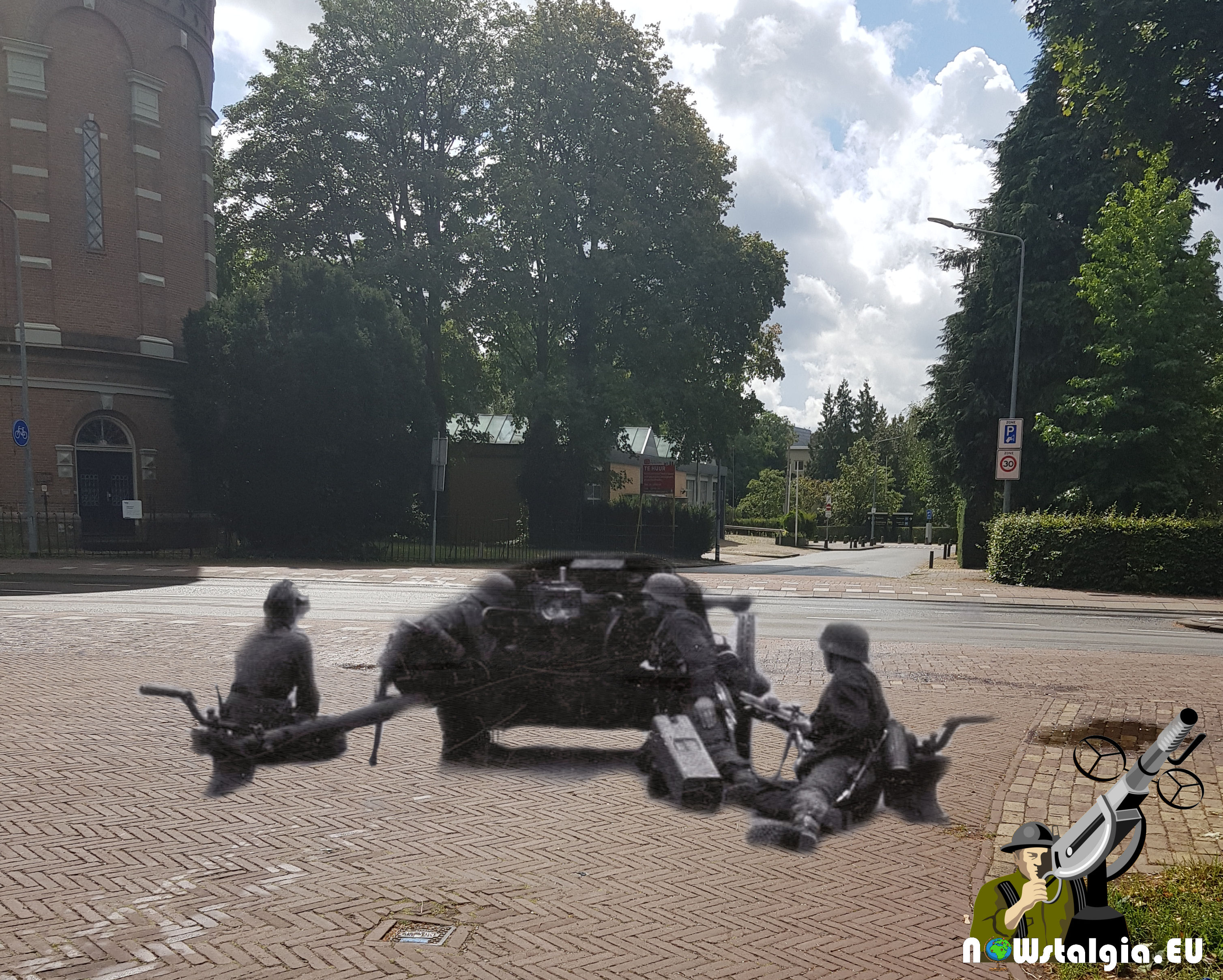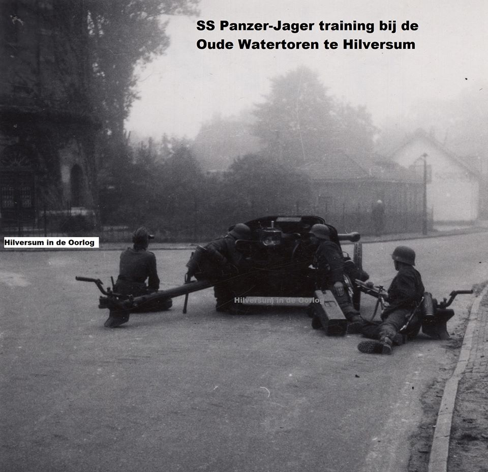 SS Panzer-Jager exercise in Hilversum near the old watertower at the Jacobus Pennweg, during the occupation of the Netherlands.