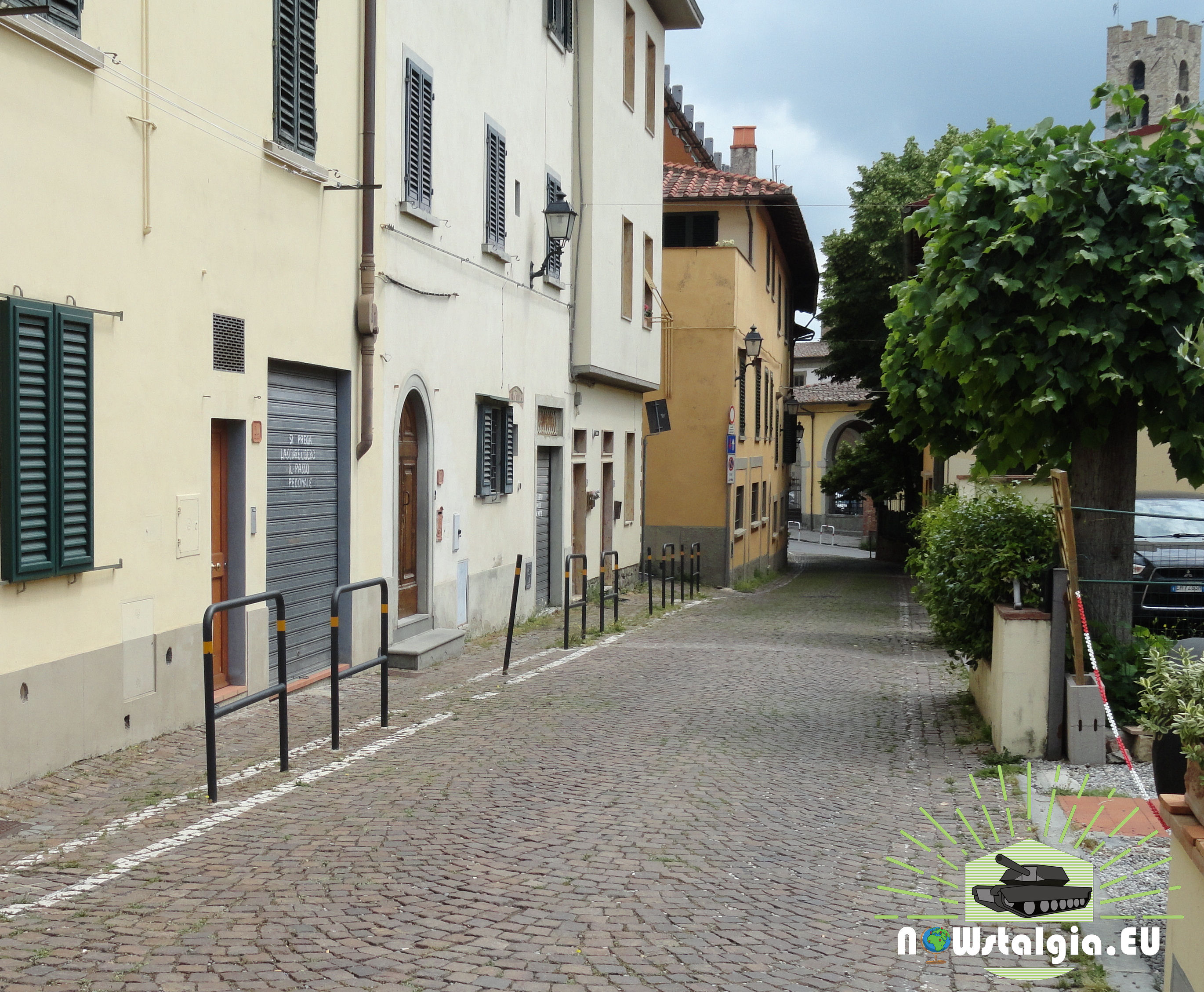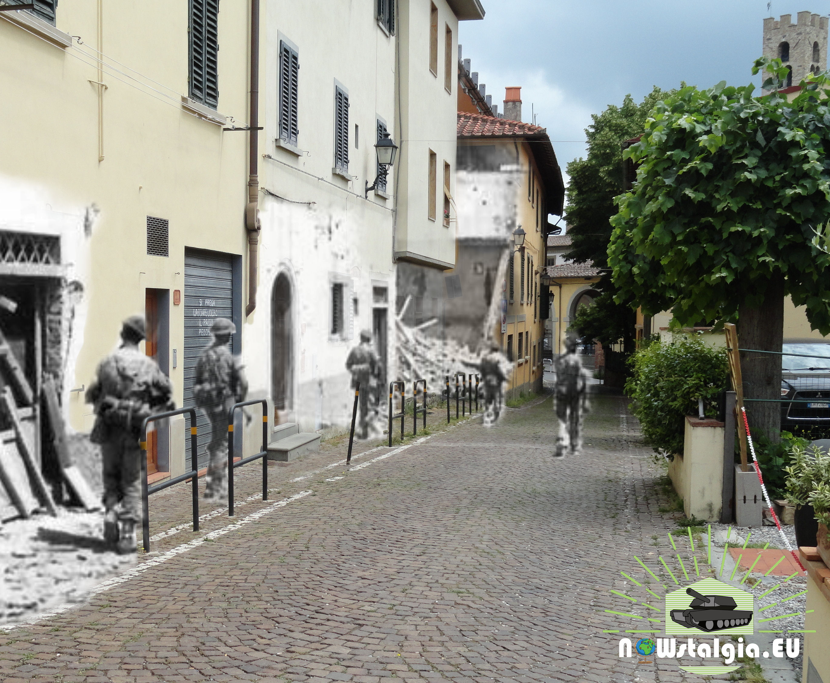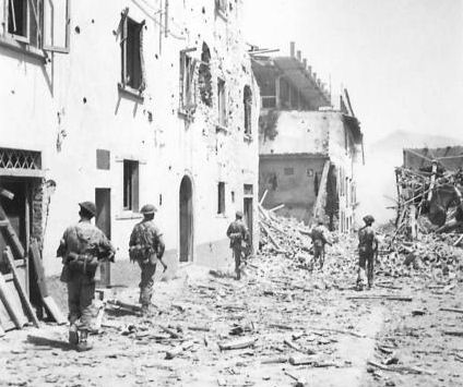 Infantry from the 8th Army move cautiously through the town during mopping-up operations, 3 August 1944.