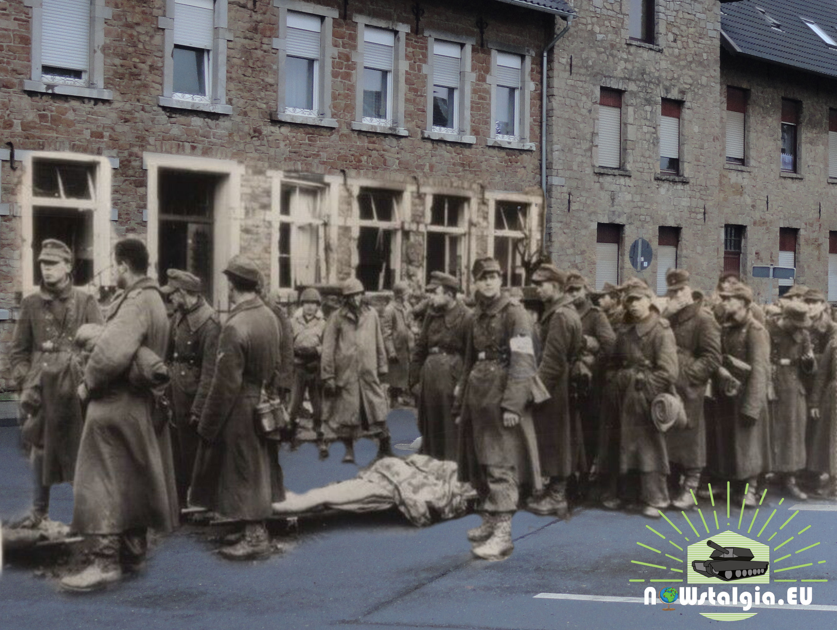 Large column of German Prisoners of War in the small city/village of Gressenich, Germany during Operation Queen, 1945.