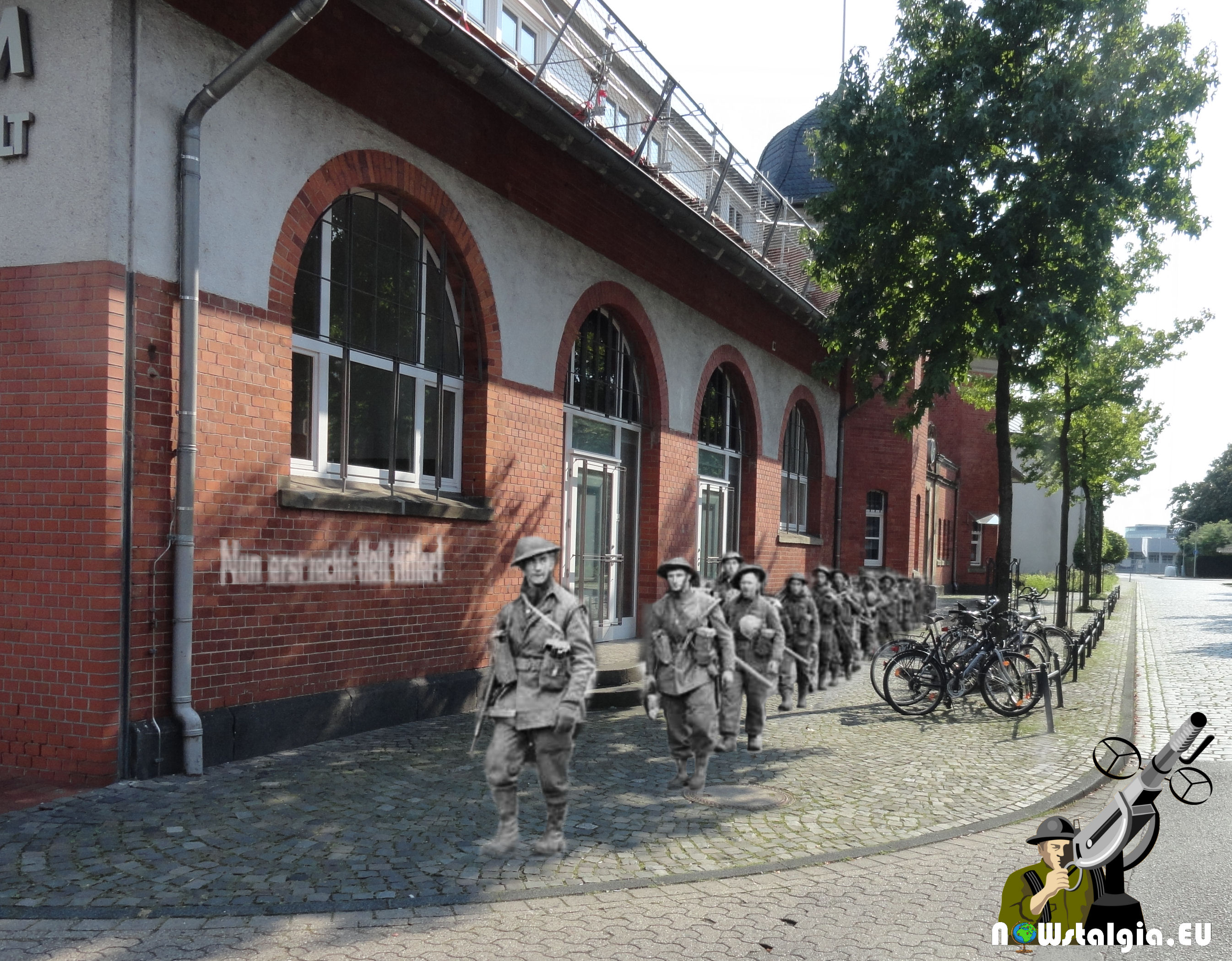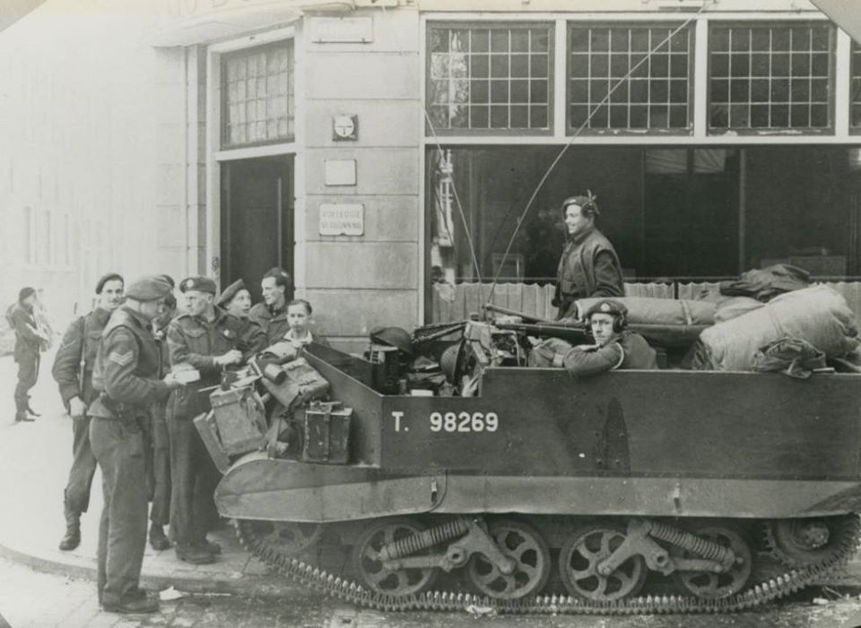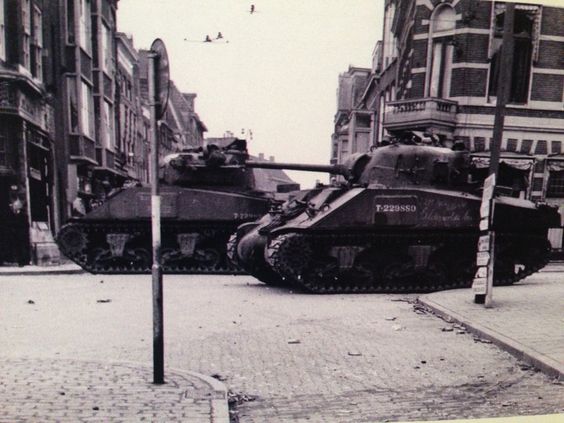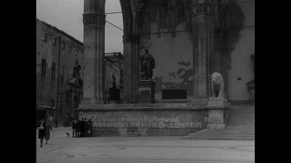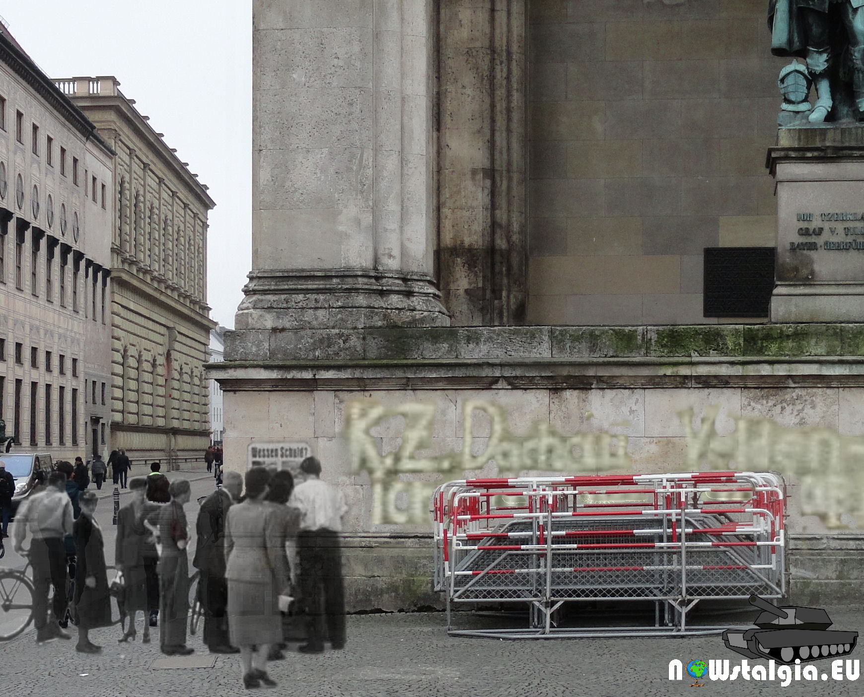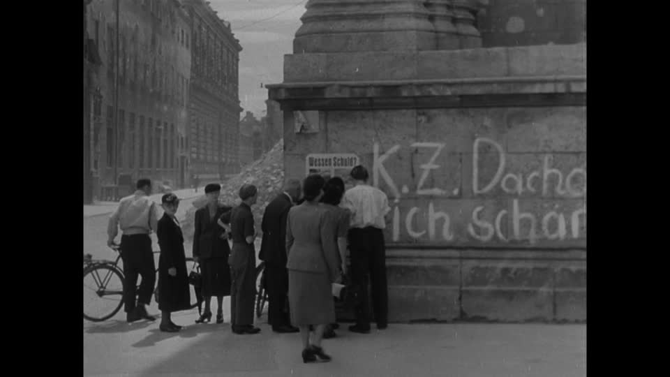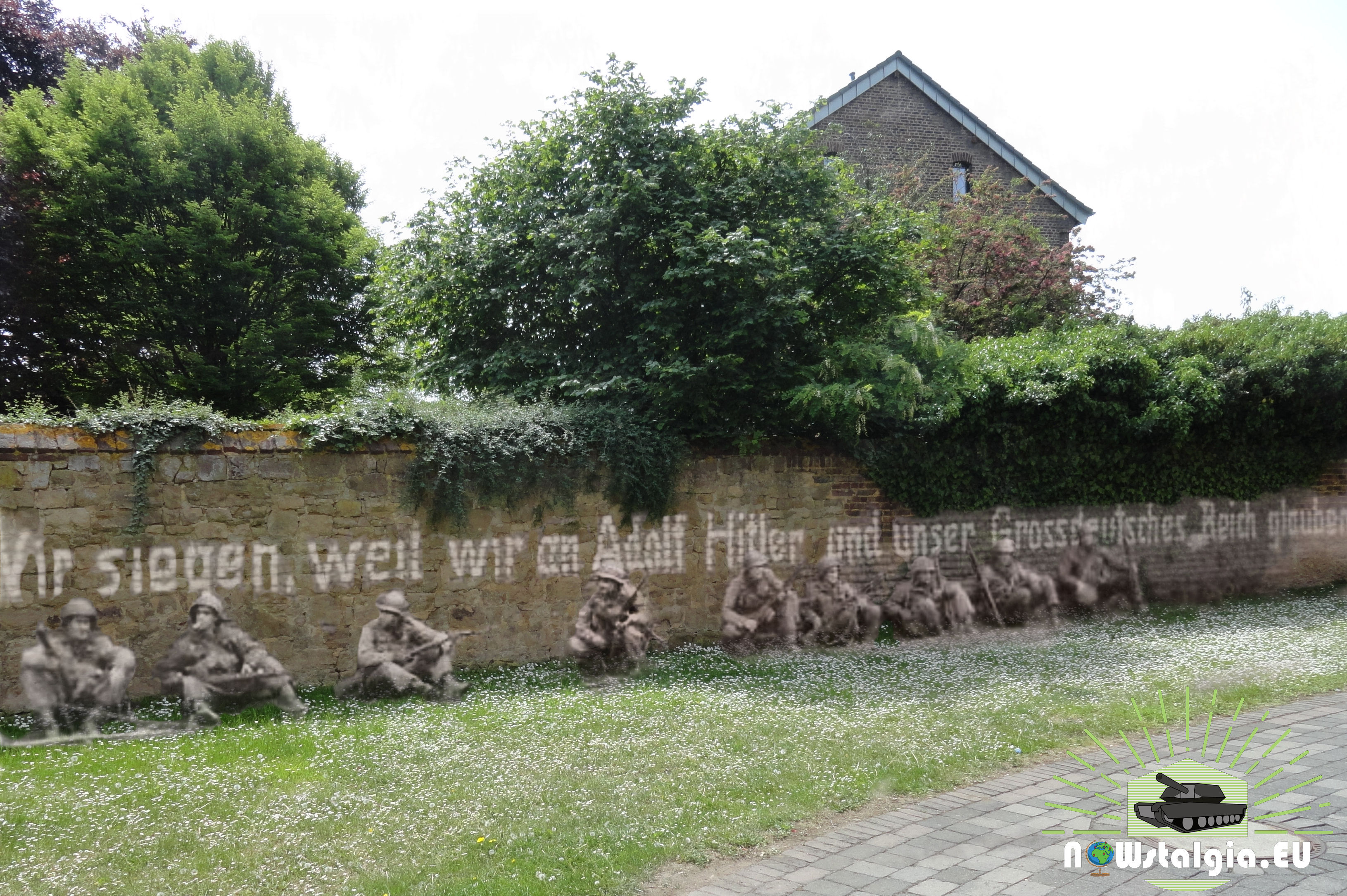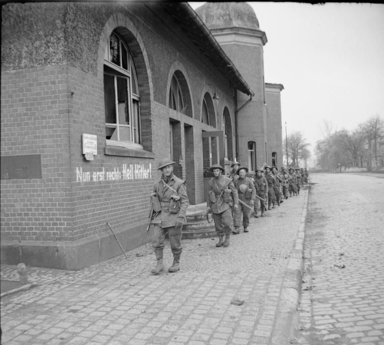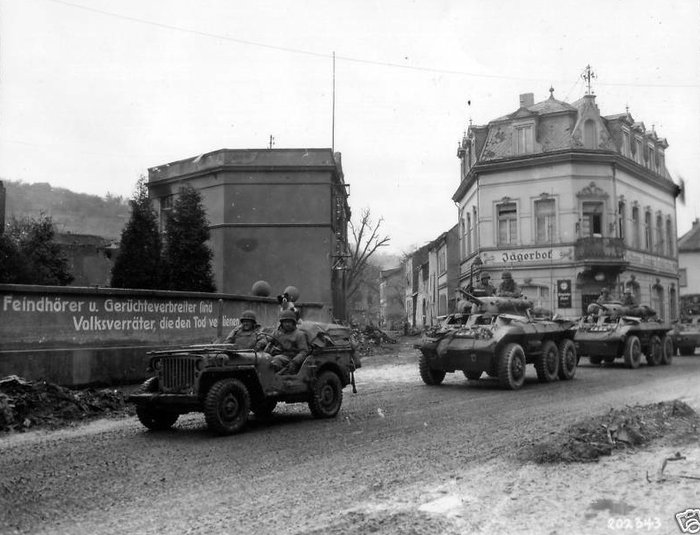 American jeeps and armored cars pause in Remagen before heading eastward across the bridge and into the heart of Germany. Note the Nazi slogan, it reads: People that listen to the enemy or people that spread rumors are traitors and should deserve the death penalty.