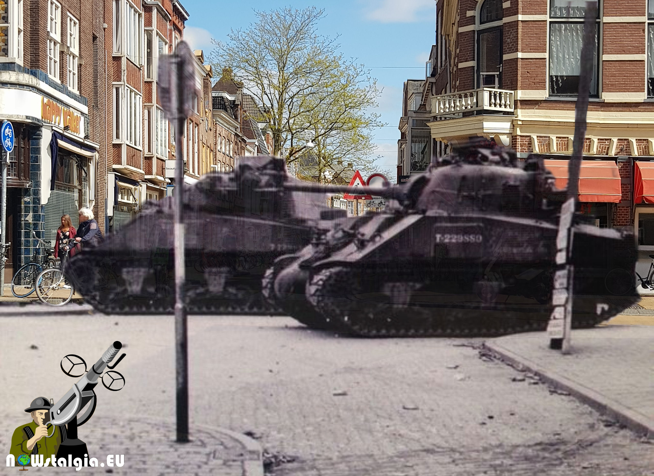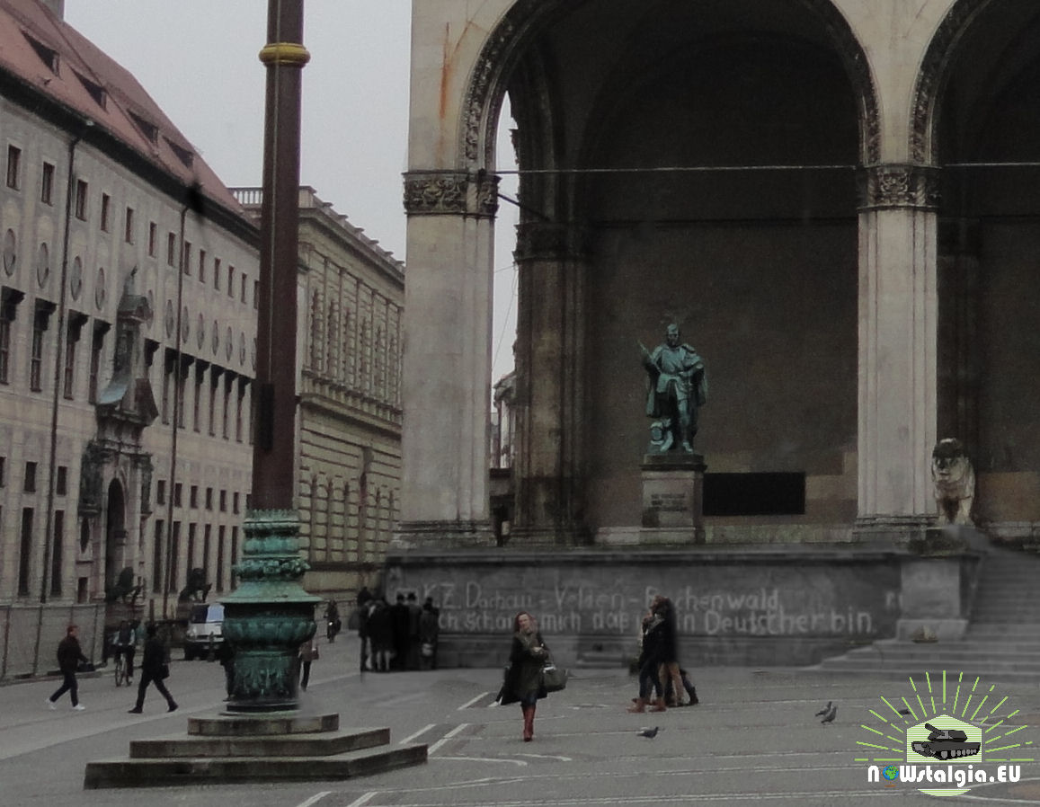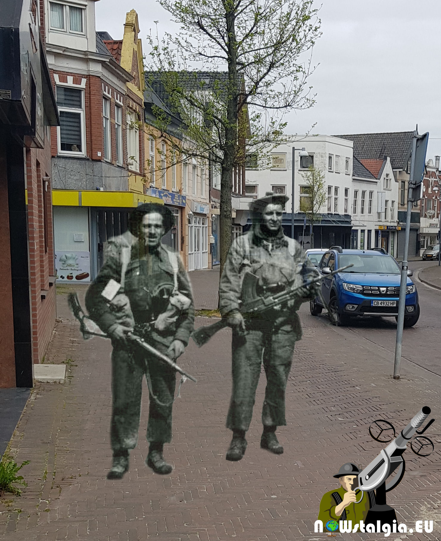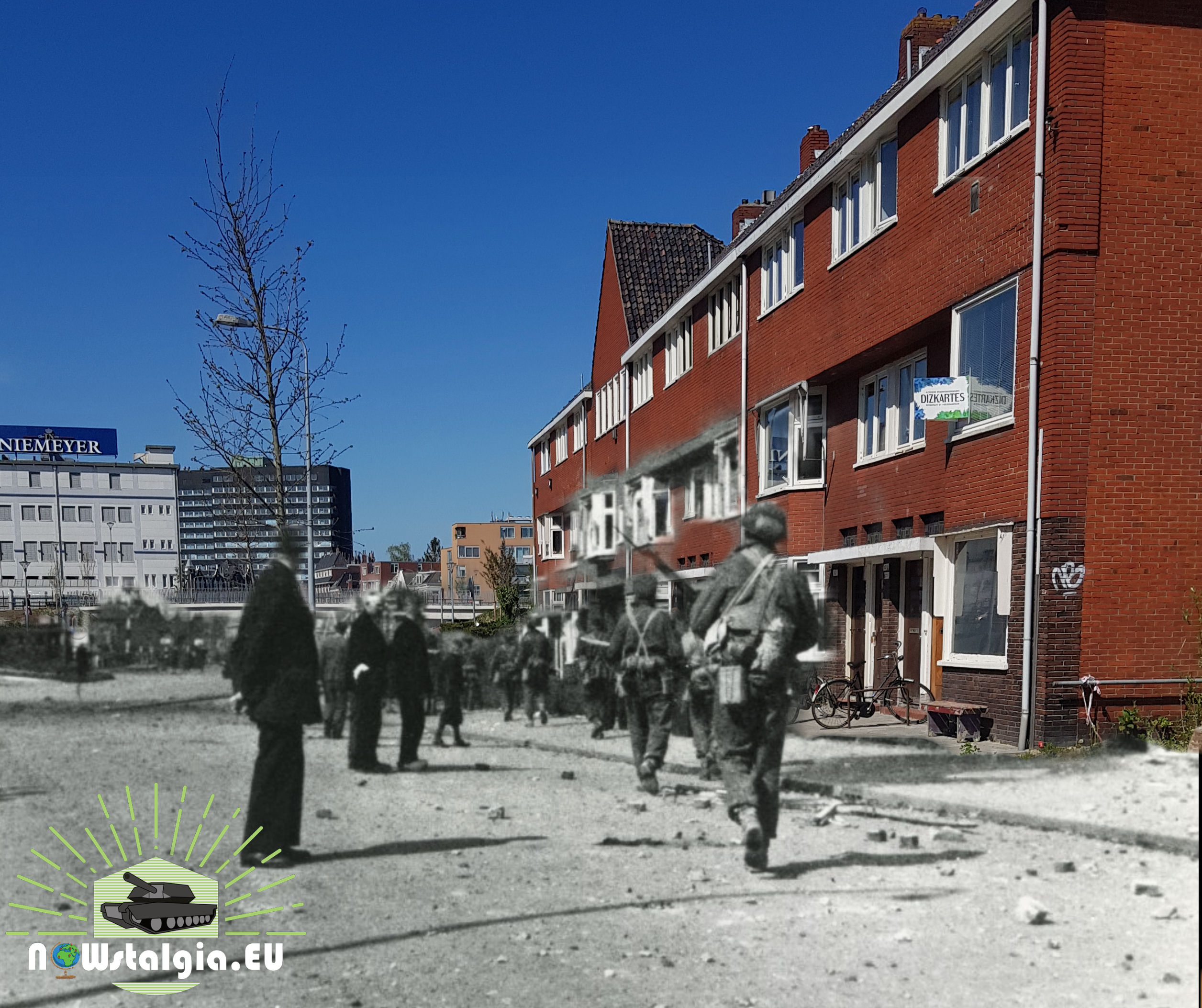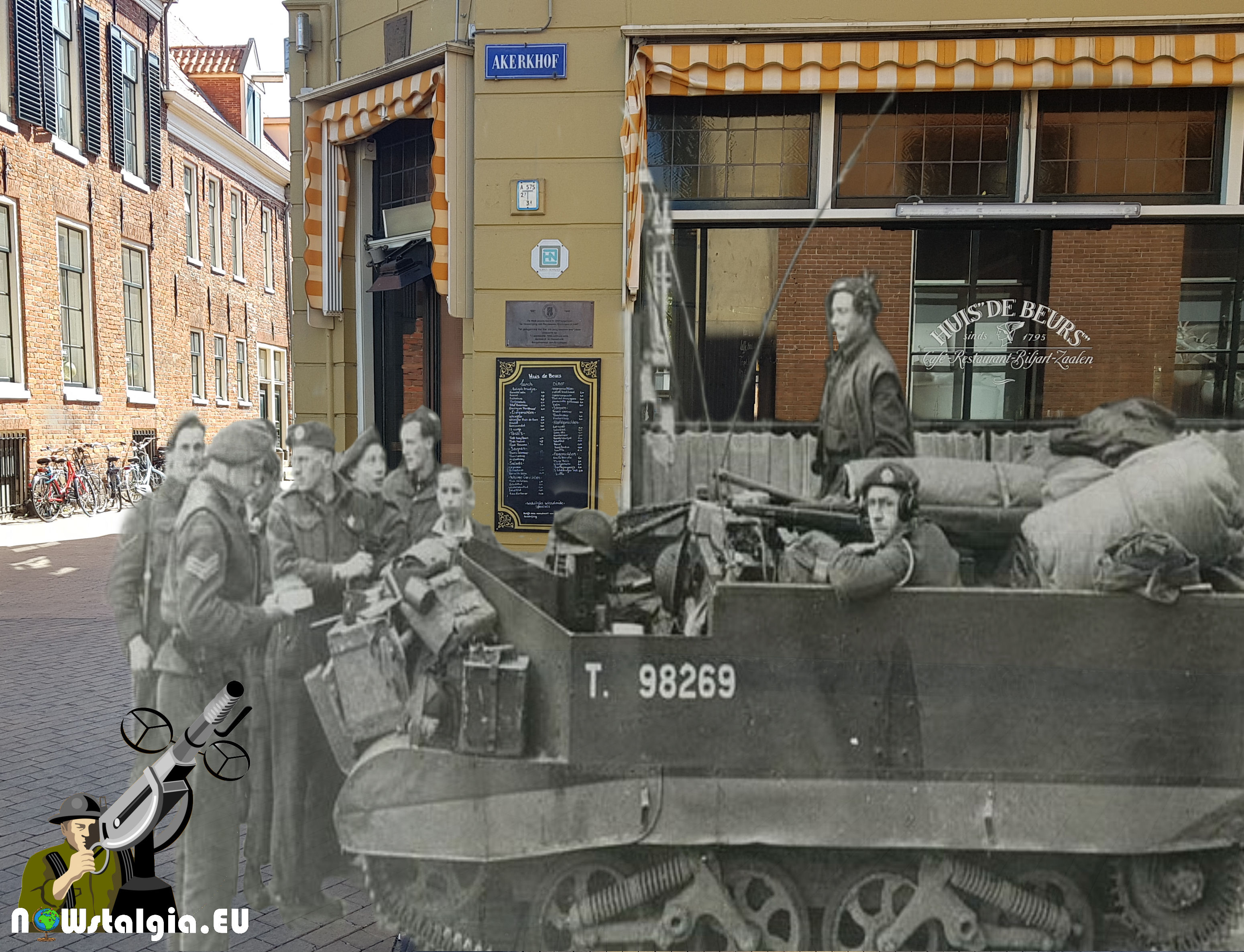 American jeeps and armored cars pause in Remagen before heading eastward across the bridge and into the heart of Germany. Note the Nazi slogan, it reads: People that listen to the enemy or people that spread rumors are traitors and should deserve the death penalty.