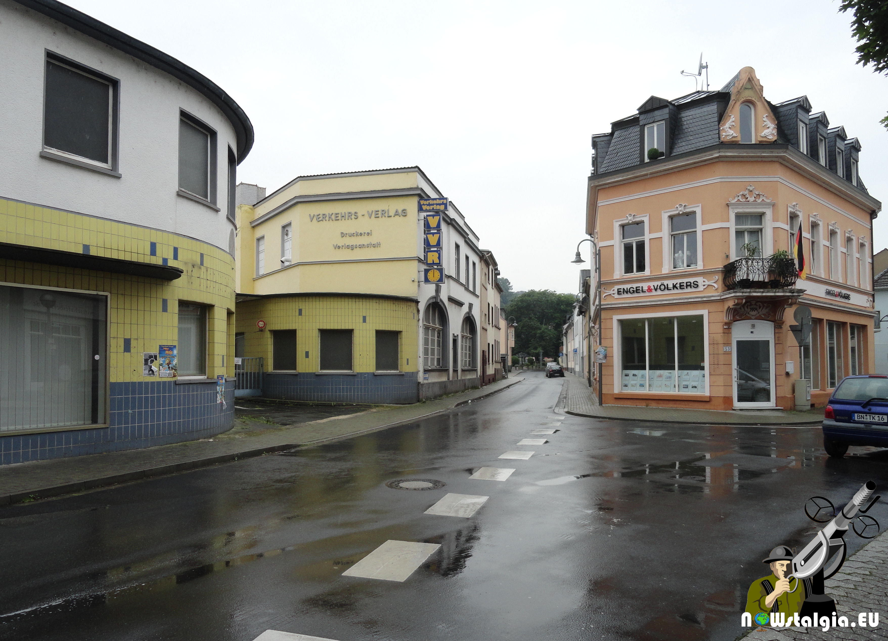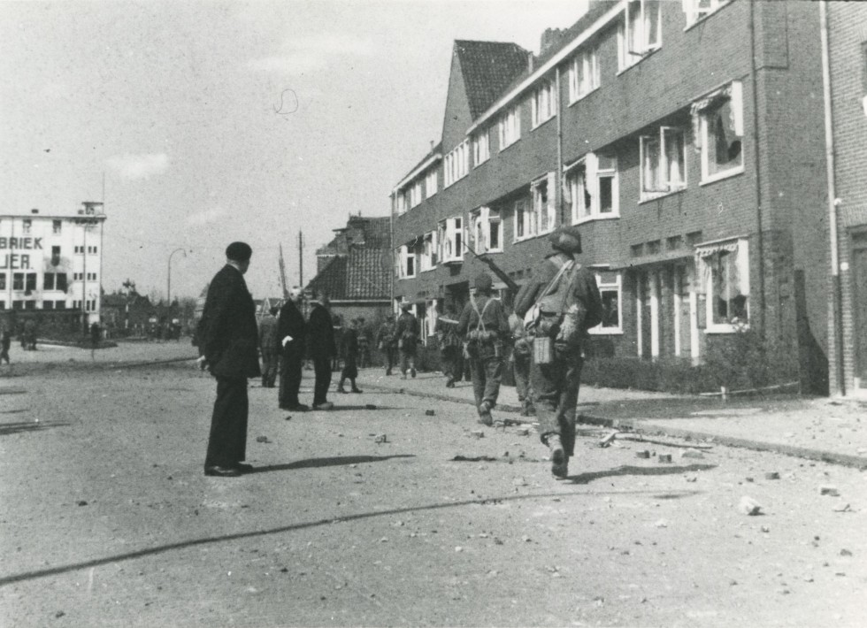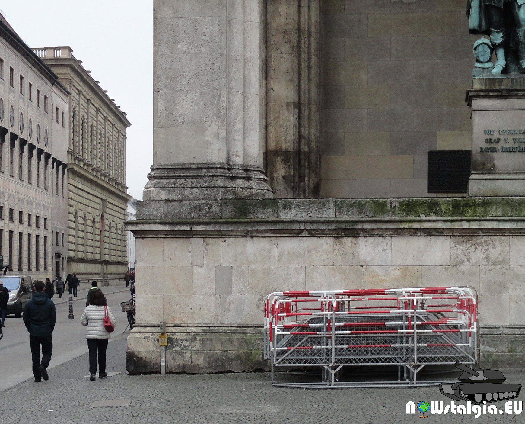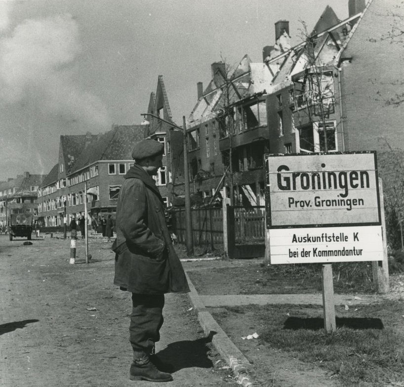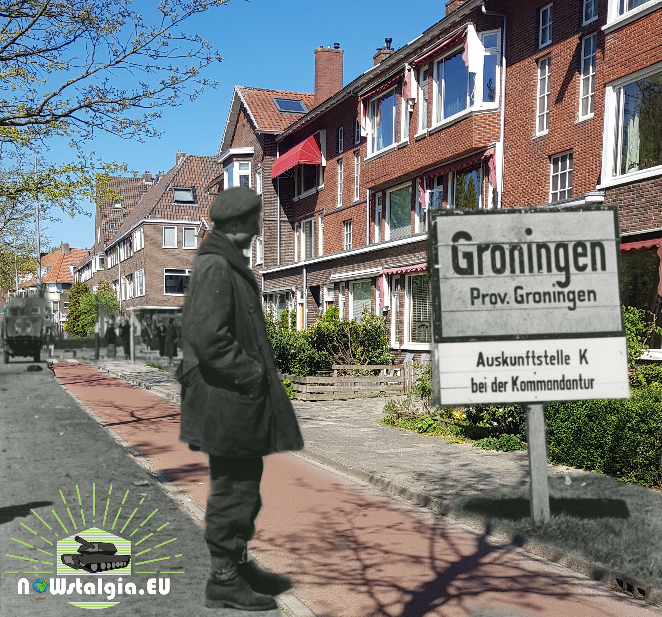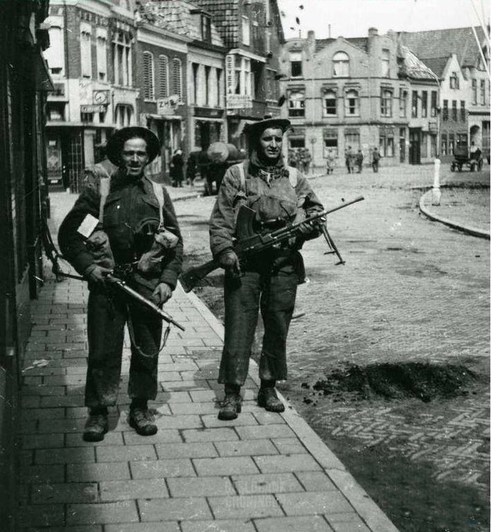 American jeeps and armored cars pause in Remagen before heading eastward across the bridge and into the heart of Germany. Note the Nazi slogan, it reads: People that listen to the enemy or people that spread rumors are traitors and should deserve the death penalty.