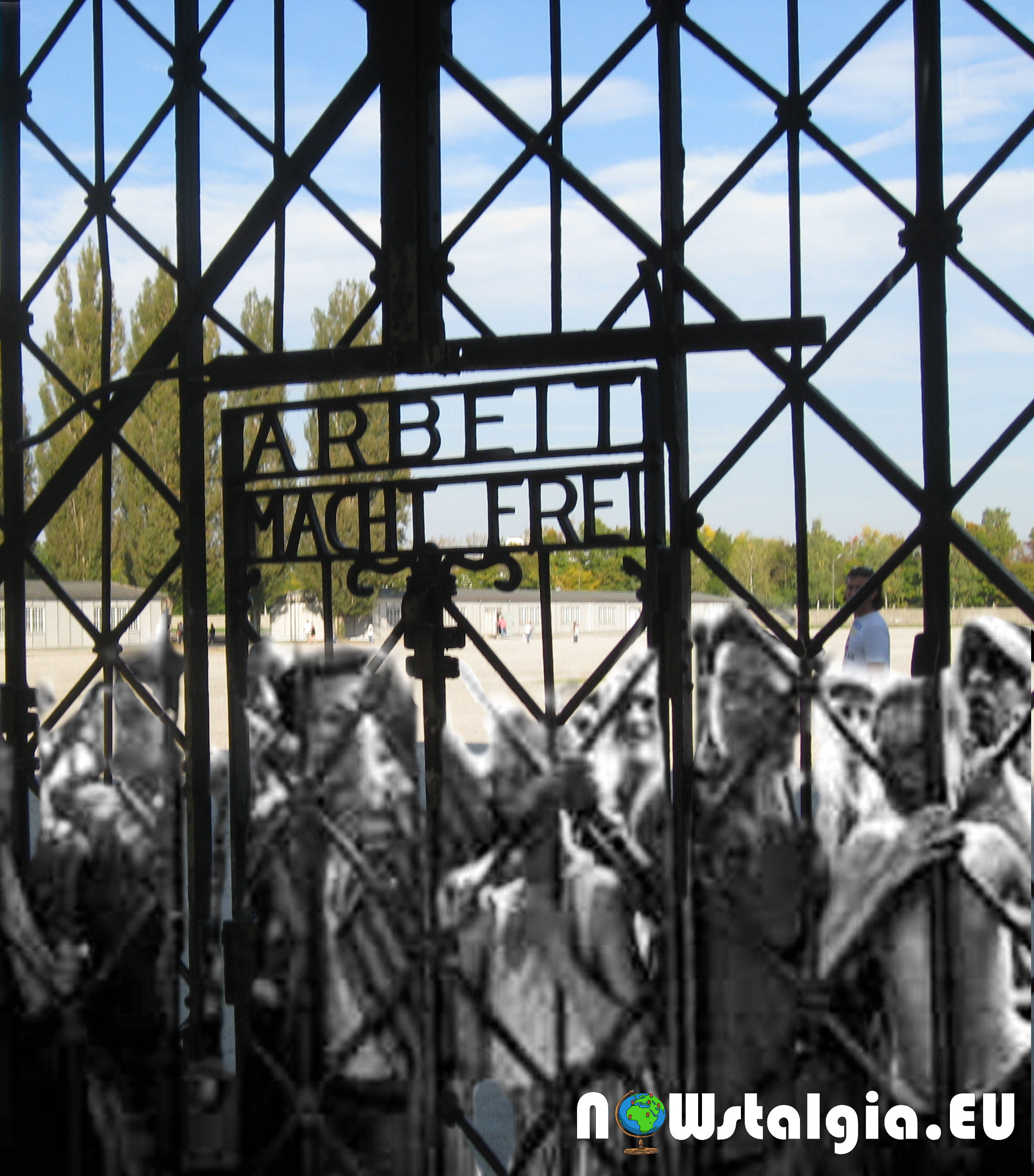 Childeren at the notorious ‘Arbeit Macht Frei’ gate in Dachau after the liberation of Dachau in 1945.