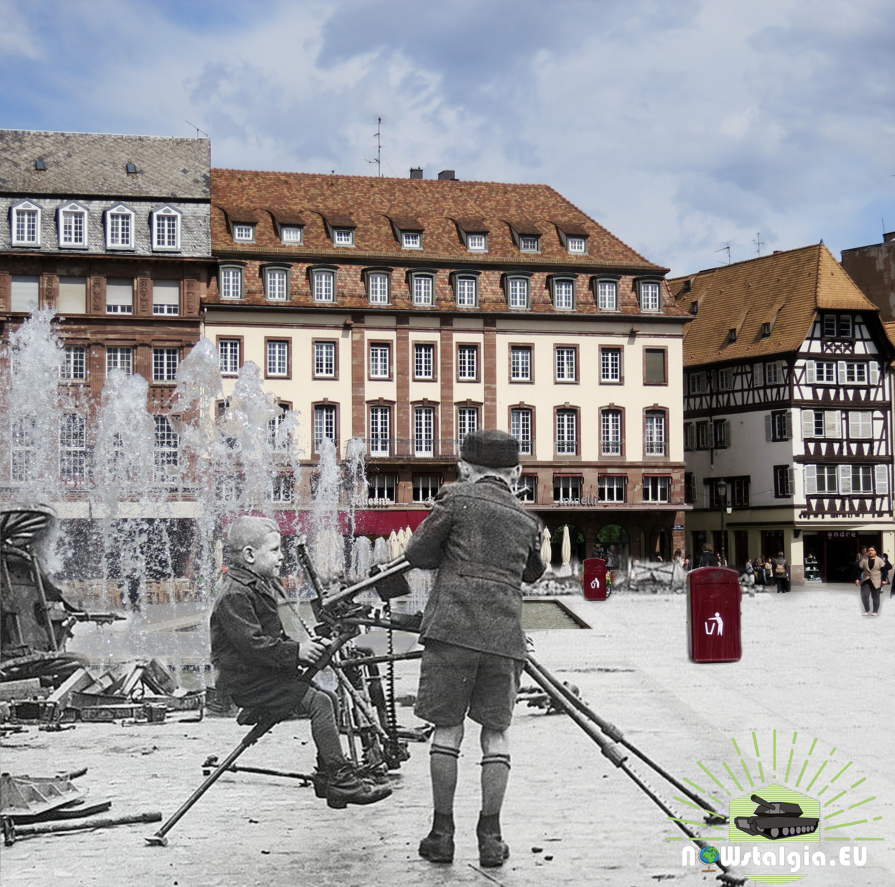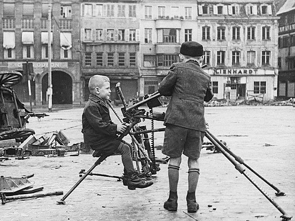 Children playing with a machinegun at the Place Kléber, Strasbourg.