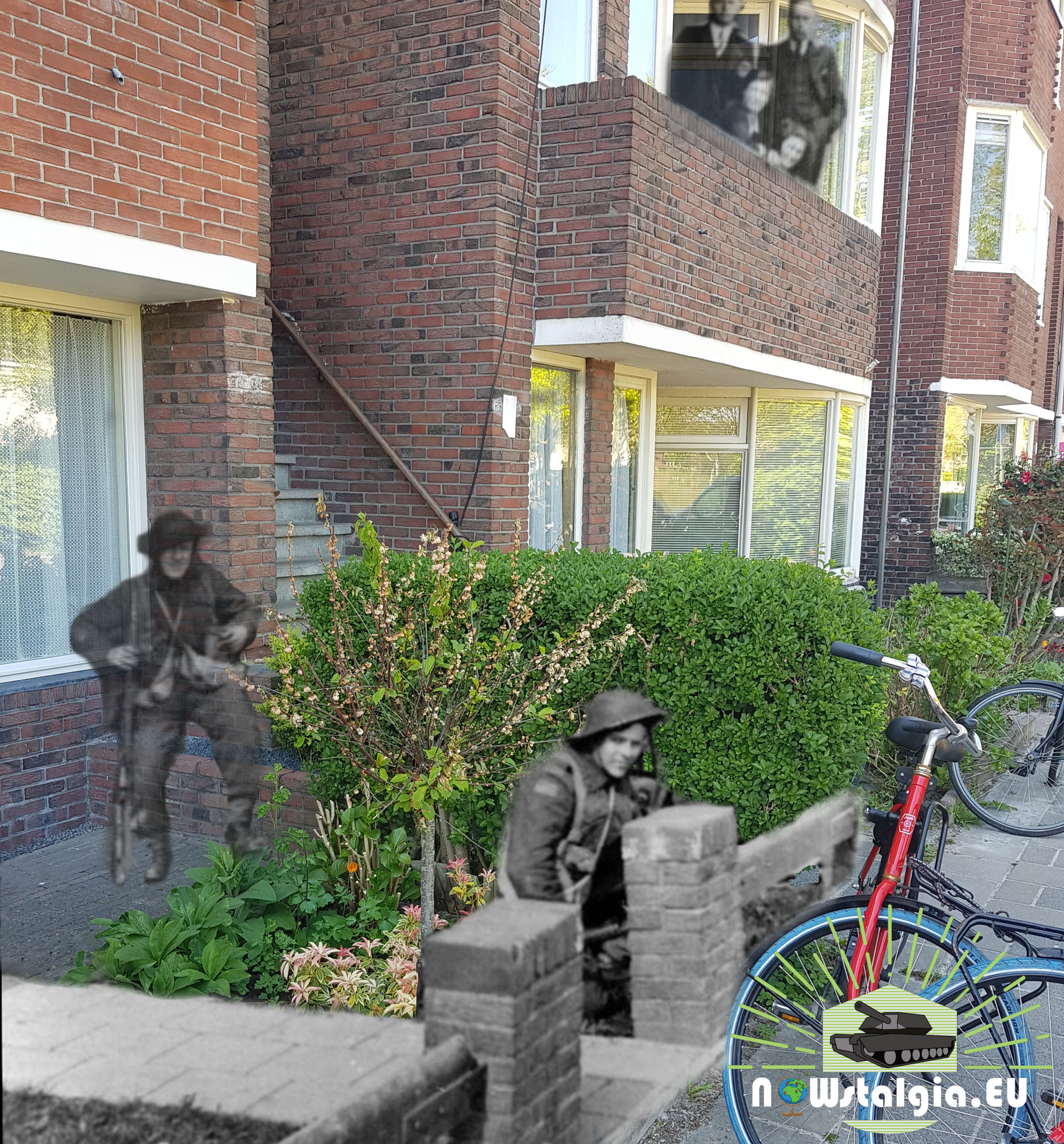 Canadian soldiers sitting in a front yard, Groningen, The Netherlands. Curious citizens are watching from the balcony. April 1945.