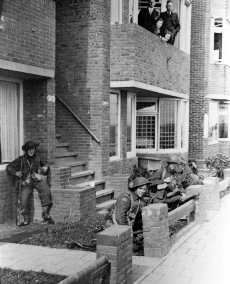 Infantrymen of the Essex Scottish Regiment on the Paterswoldseweg during the liberation of Groningen.