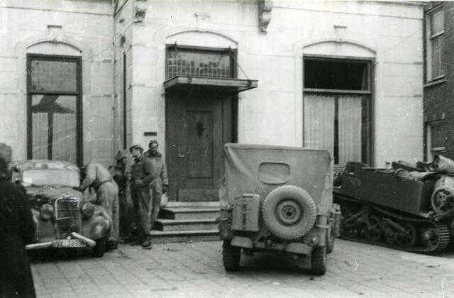 Liberation Delfzijl, Allied troops inspect a destroyed SS Mercedes in front of the former town hall of Delfzijl on the Oude Schans in 1945.