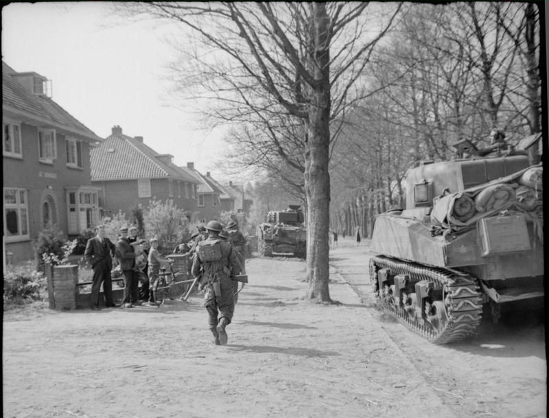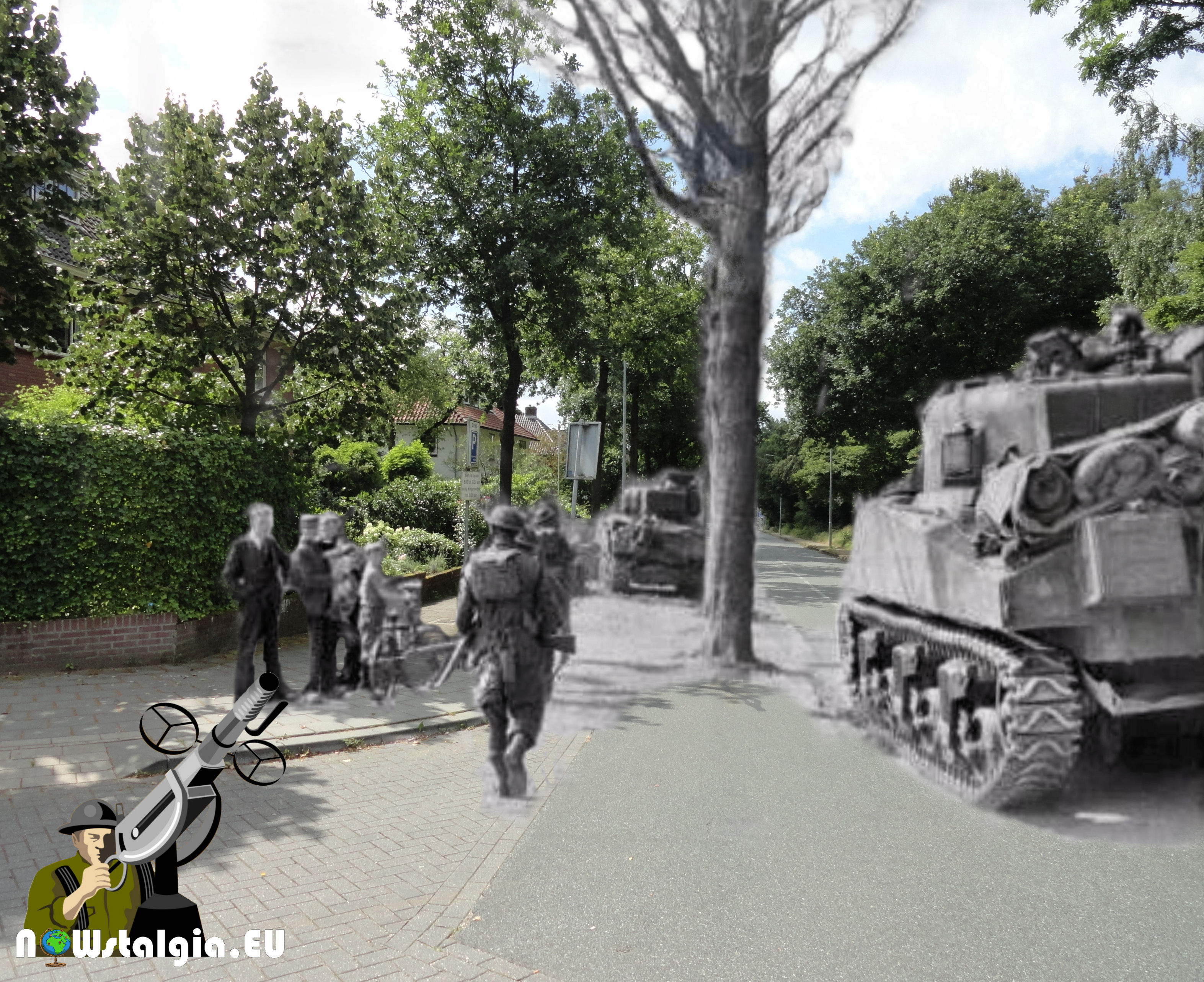 Sherman tanks of the 5th Canadian Armoured Division and infantry of the 11th Royal Scots Fusiliers, 49th (West Riding) Division, advance through the outskirts of Ede in Holland, 17 April 1945. (note: the archway door is still there but behind the hedge)