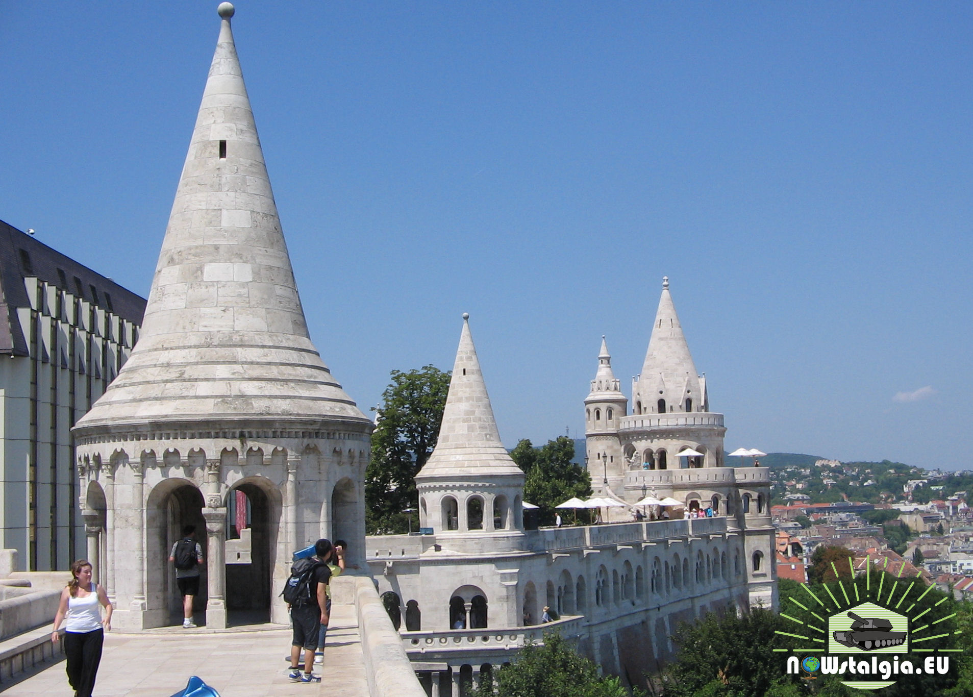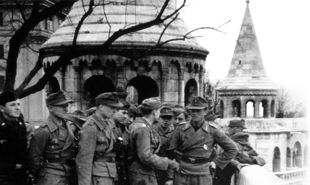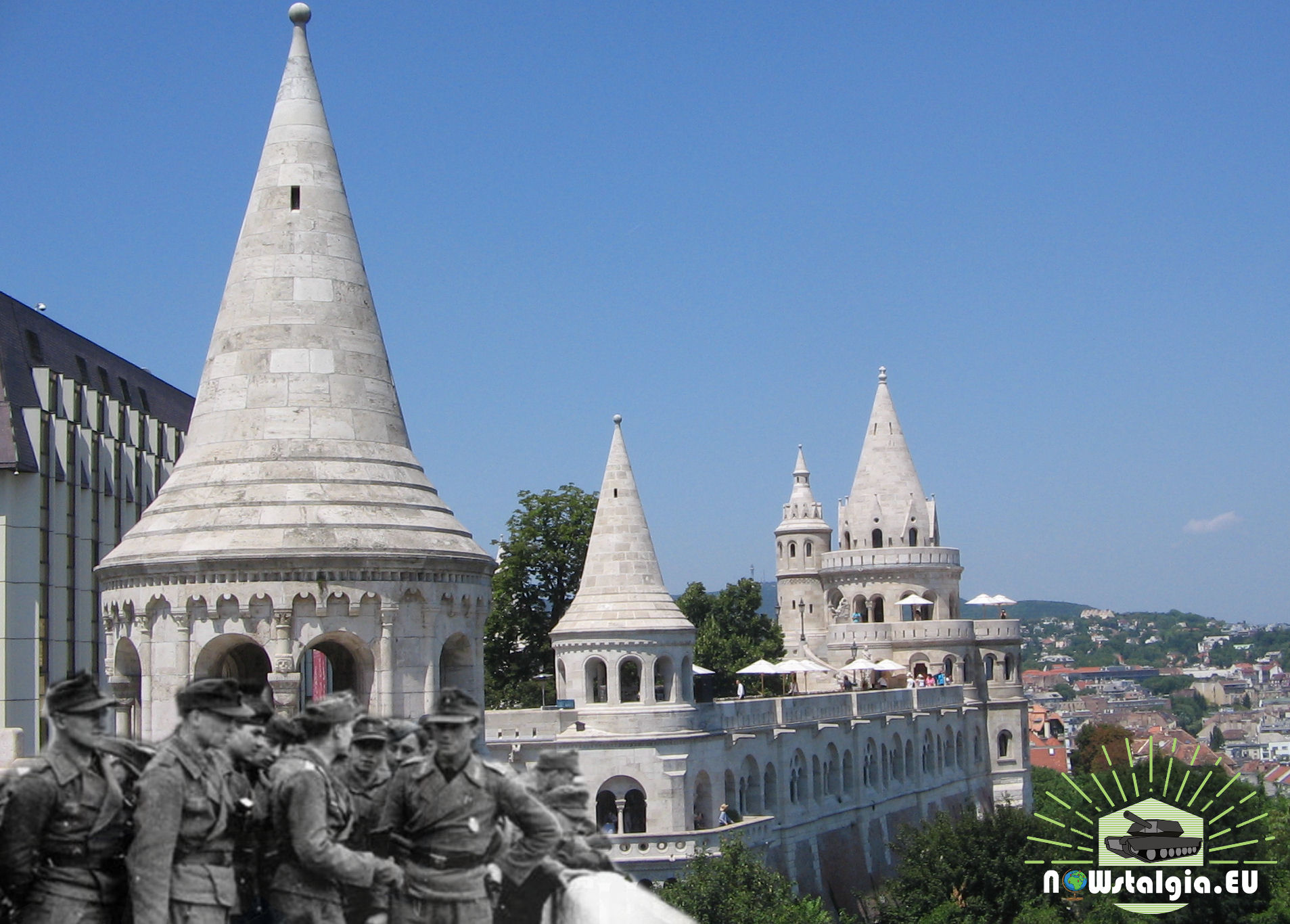 German soldiers sightseeing and look over the conquered Hungarian capital from the terrace of the Fishermans bastion in Budapest 1944.