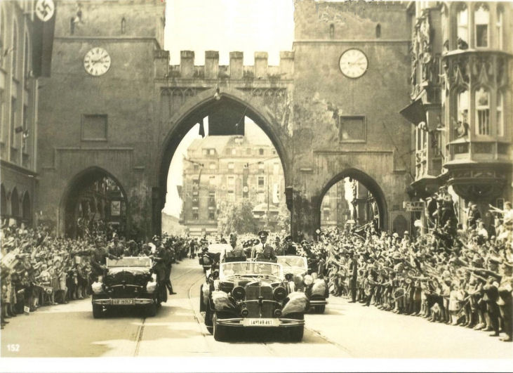 Hitler and Mussolini in München at the Karlstor. Then photo probably taken in 1938.