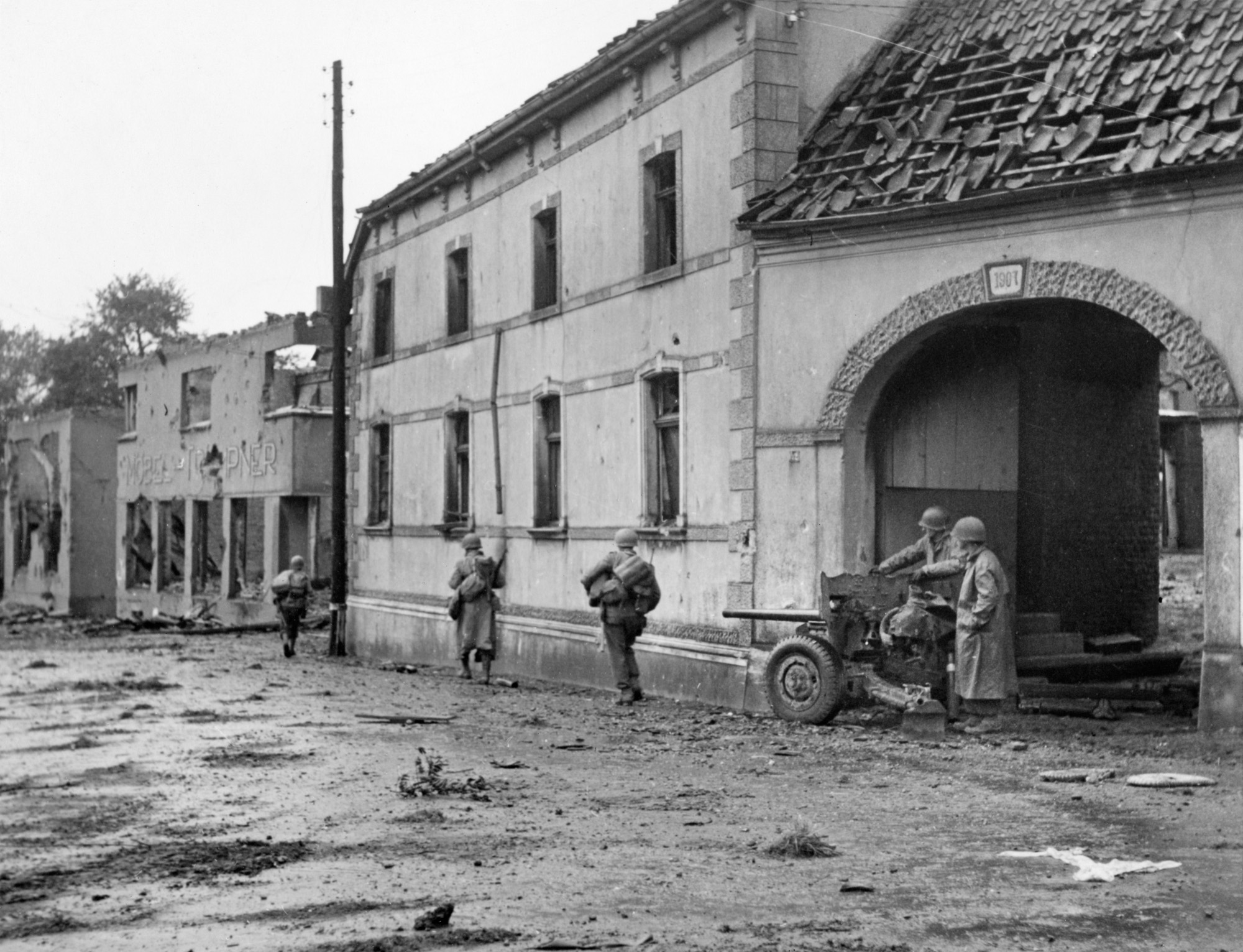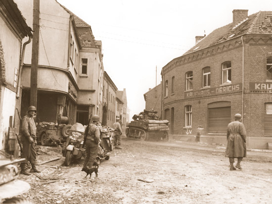 U.S. infantry (30th Division, probably 117th) patrol moves cautiously down one of the shattered street of Ubach-Palenberg just captured.