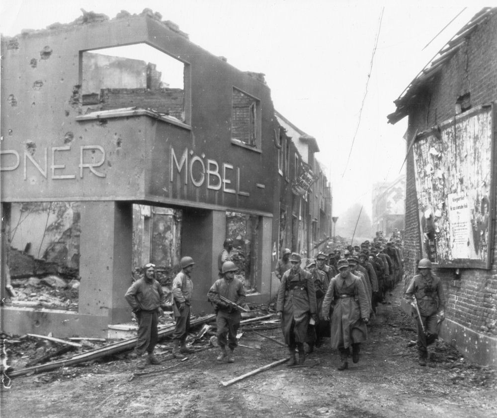 Germans captured in a Siegfriedline pillbox by US first army troops are marched into Ubach-Palenberg, Germany through the Bahnstraße, 11 October 1944.