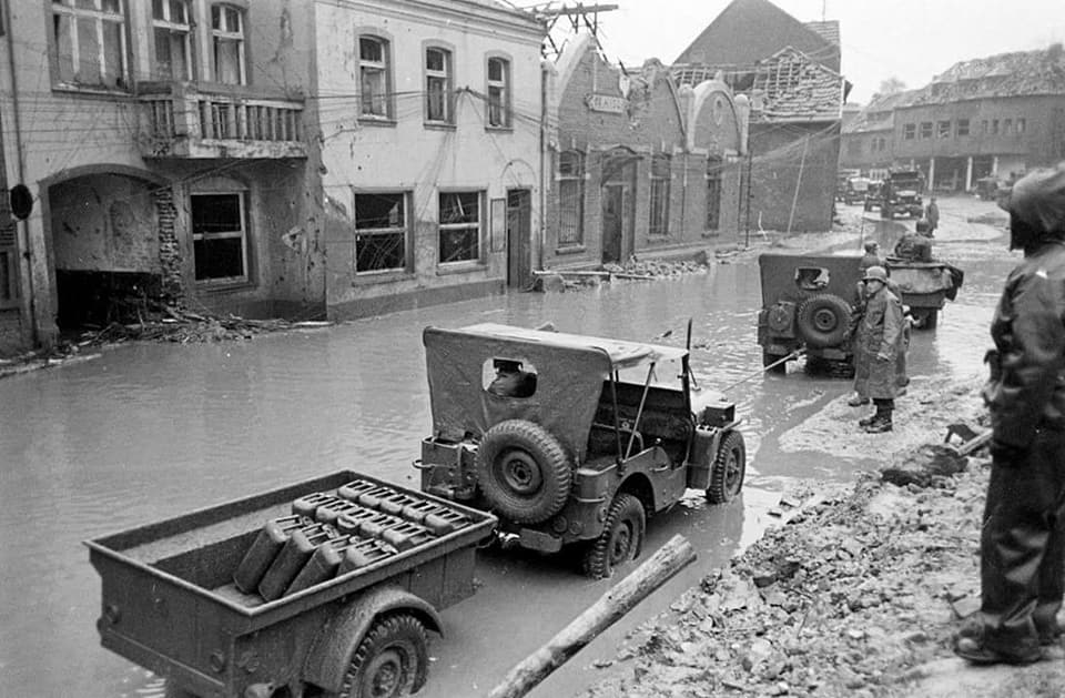 Soldiers of the 9th Army in the flooded streets of Ubach Palenberg, 1944.