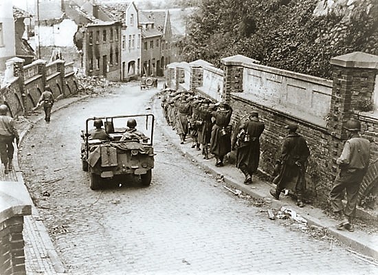 German soldiers that surrendered are bringing from Kirchberg in Ubach – Palenberg.