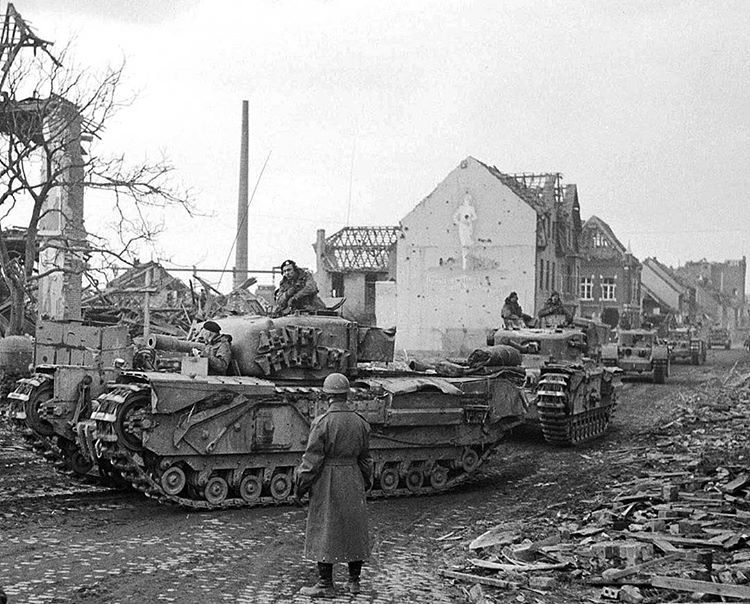 Tanks in the Bahnhofstraße in Goch, Germany, during Operation Veritable