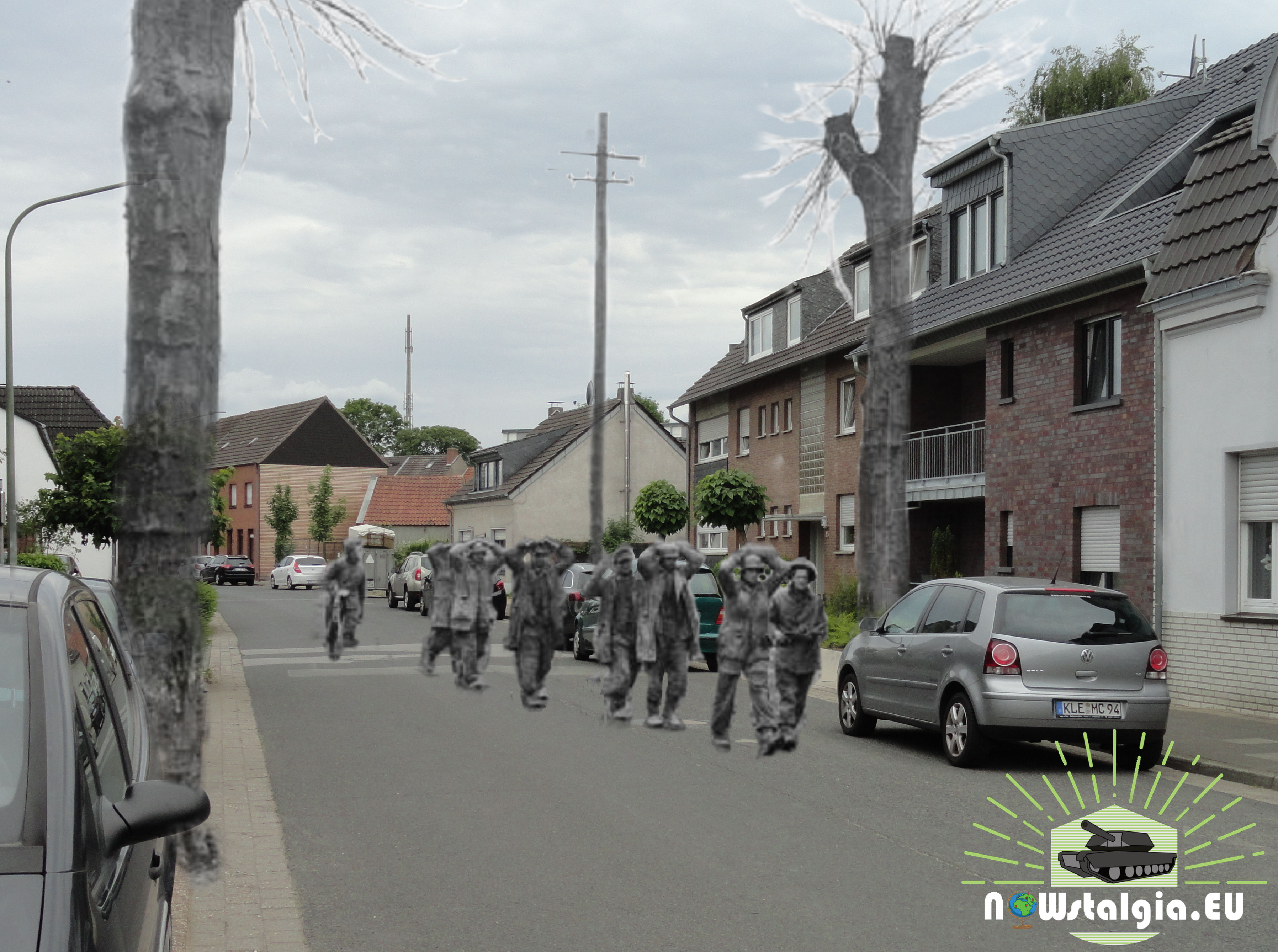 Mislabeled as ” ‘A’ Squadron moving out of Brunen’, Germany, 1945.” I discovered it was taken in Hamminkeln. I went over there and took this now photo on my kitchen steps.