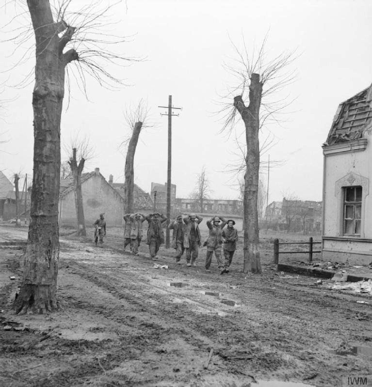 Two Scottisch soldiers are escorting 6 surrendered German soldiers during Operation Veritable in February 1945.