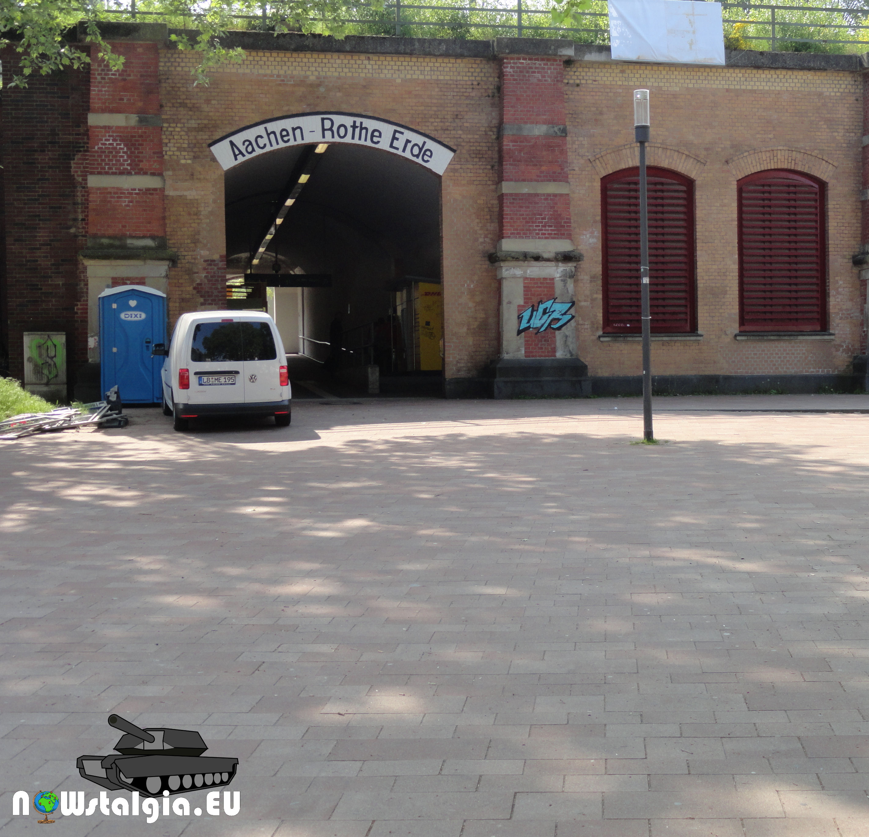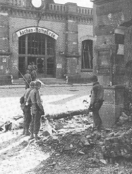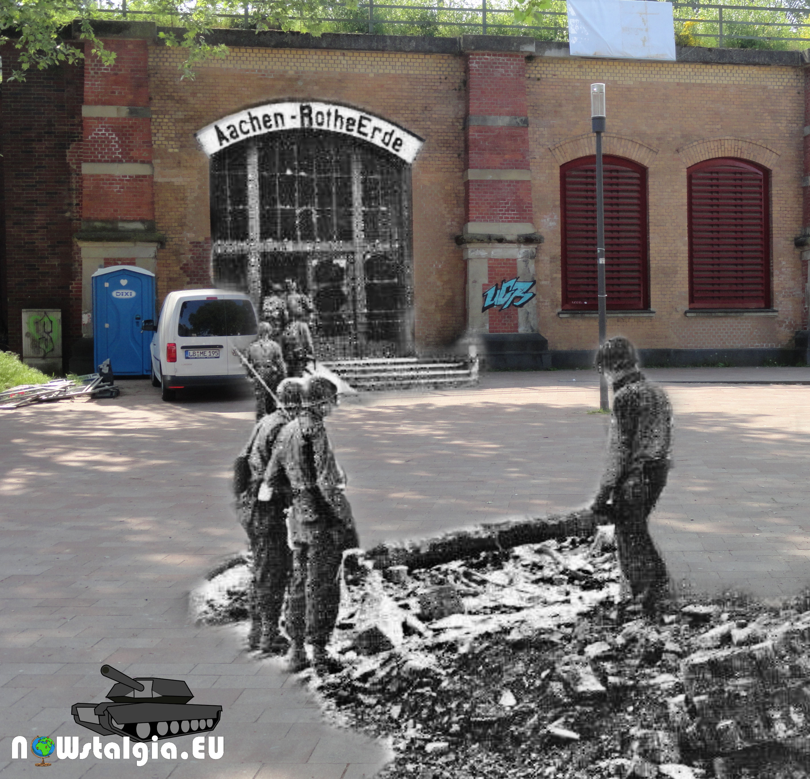 We all know the sherman tank that will appear through the arch at Bahnhof Aachen – Rothe Erde. This shot is probably just before the Sherman tank is coming through that arch. Difficult because of the quality of the old photo.