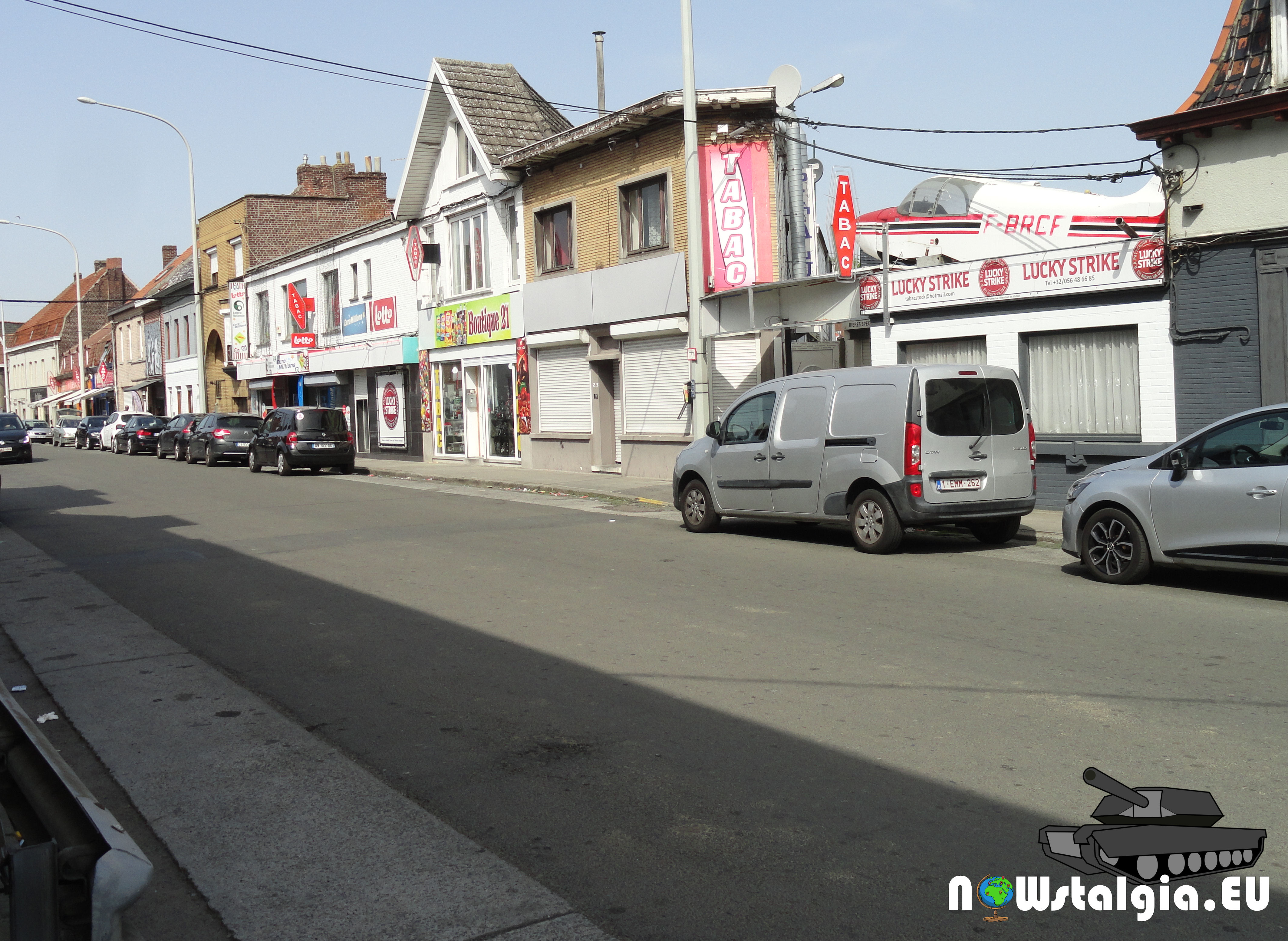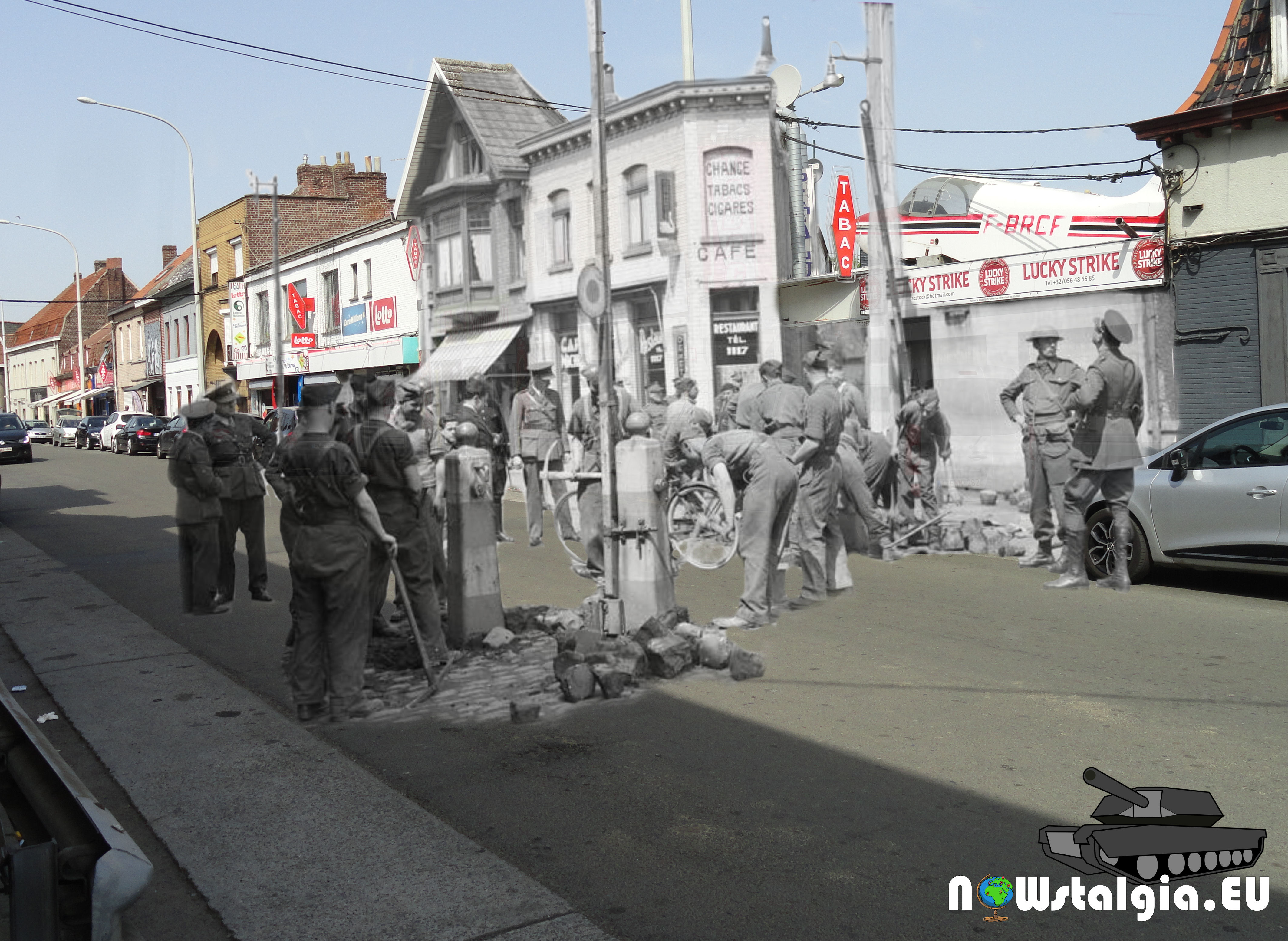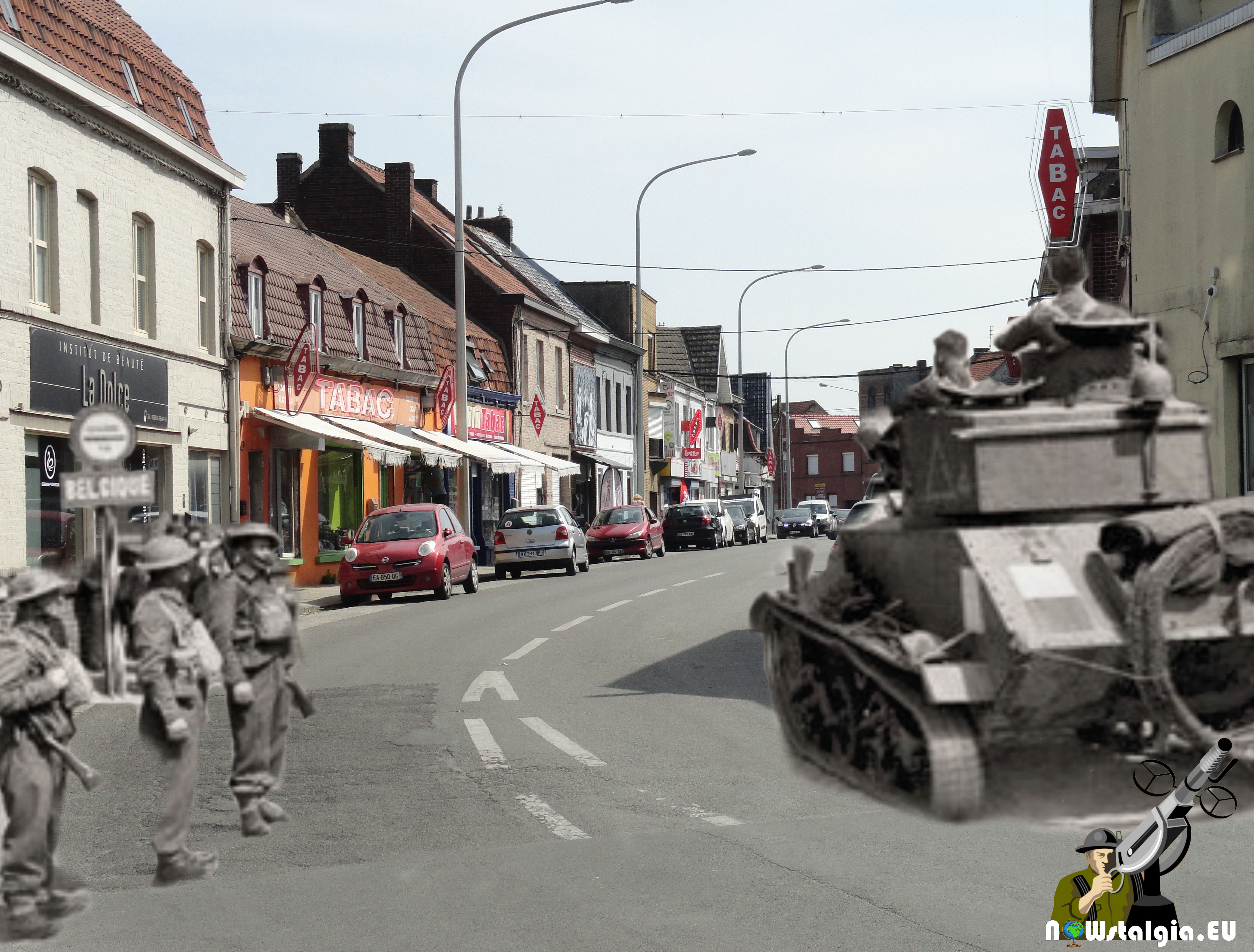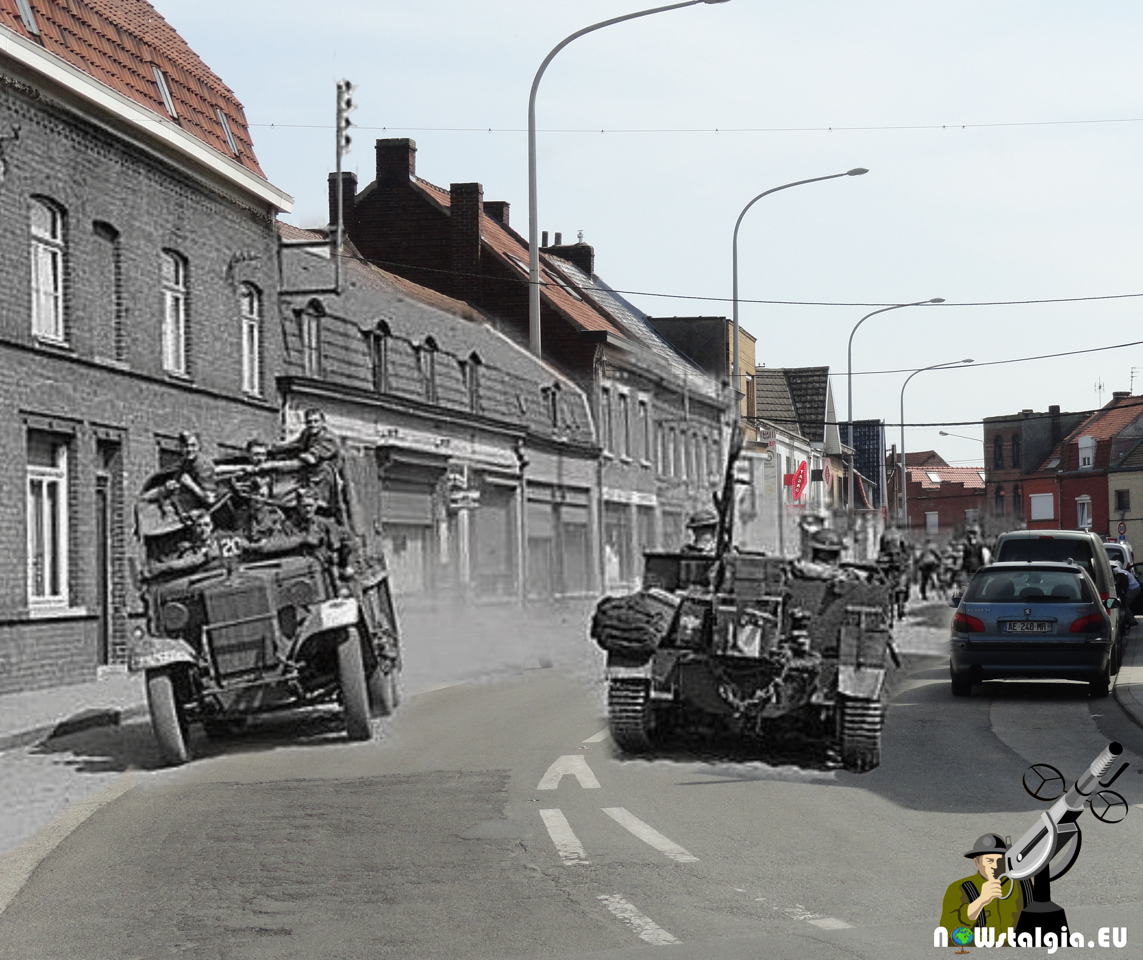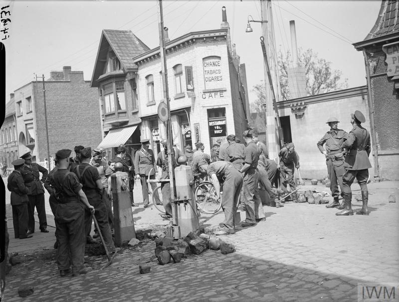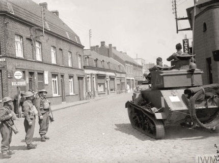 Carriers and trucks move through Herseaux, as the BEF crosses the border into Belgium, 10 May 1940.