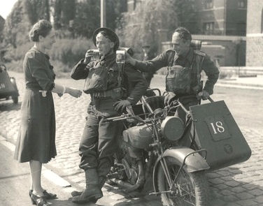 Belgian girls give flowers to British troops riding a Norton motorcycle combination in Herseaux, as the BEF crosses the border into Belgium, 10 May 1940.