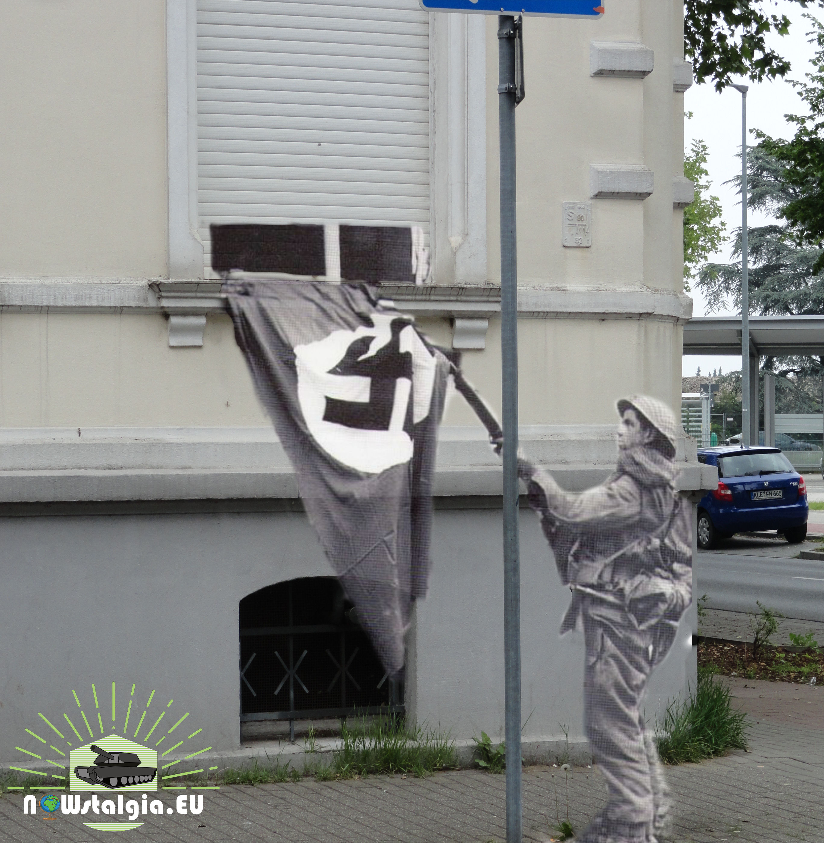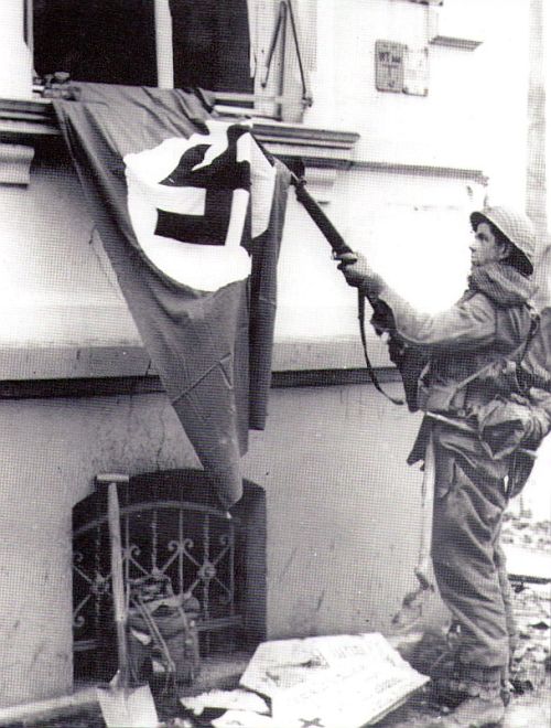 Allied soldier removes a swastika flag at the corner of the Herzogstrasse / Bahnhofstrasse, Kleve Germany 1945.
